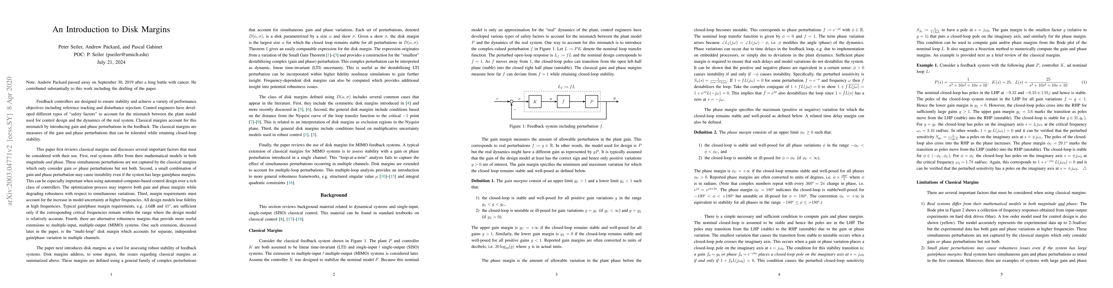 This paper introduces disk margins as robust stability measures that account for simultaneous gain and phase perturbations in feedback systems, providing a more accurate assessment of robustness than traditional methods.