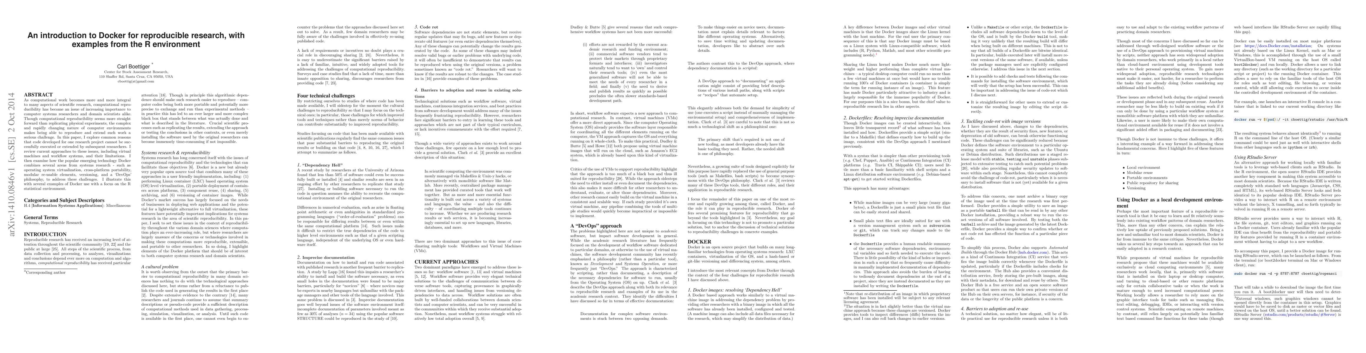 This paper introduces Docker as a tool to improve reproducibility in research projects, particularly those using the R environment, by addressing common challenges such as code portability and version control.