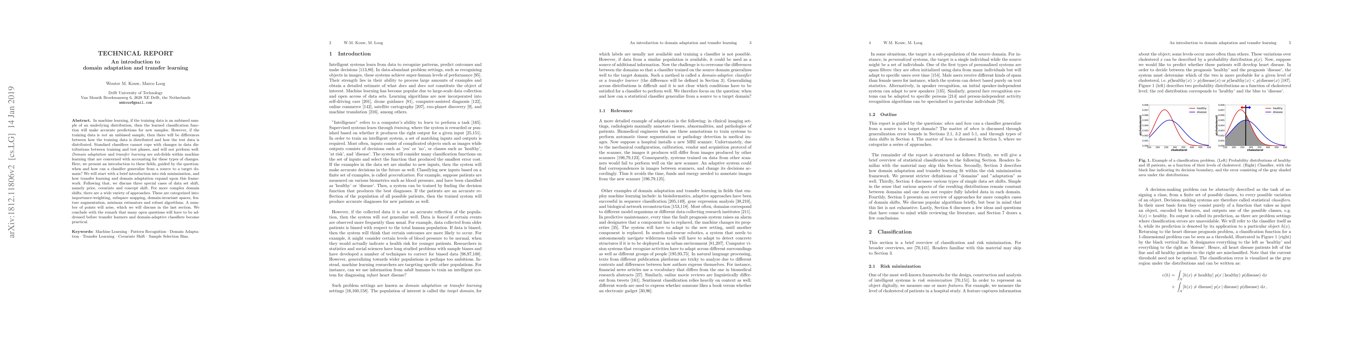 In machine learning, if the training data is an unbiased sample of an underlying distribution, then the learned classification function will make accurate predictions for new samples. However, if the training data is not an unbiased sample, then there will be differences between how the training data is distributed and how the test data is distributed. Standard classifiers cannot cope with changes in data distributions between training and test phases, and will not perform well. Domain adaptation and transfer learning are sub-fields within machine learning that are concerned with accounting for these types of changes. Here, we present an introduction to these fields, guided by the question: when and how can a classifier generalize from a source to a target domain? We will start with a brief introduction into risk minimization, and how transfer learning and domain adaptation expand upon this framework. Following that, we discuss three special cases of data set shift, namely prior, covariate and concept shift. For more complex domain shifts, there are a wide variety of approaches. These are categorized into: importance-weighting, subspace mapping, domain-invariant spaces, feature augmentation, minimax estimators and robust algorithms. A number of points will arise, which we will discuss in the last section. We conclude with the remark that many open questions will have to be addressed before transfer learners and domain-adaptive classifiers become practical.