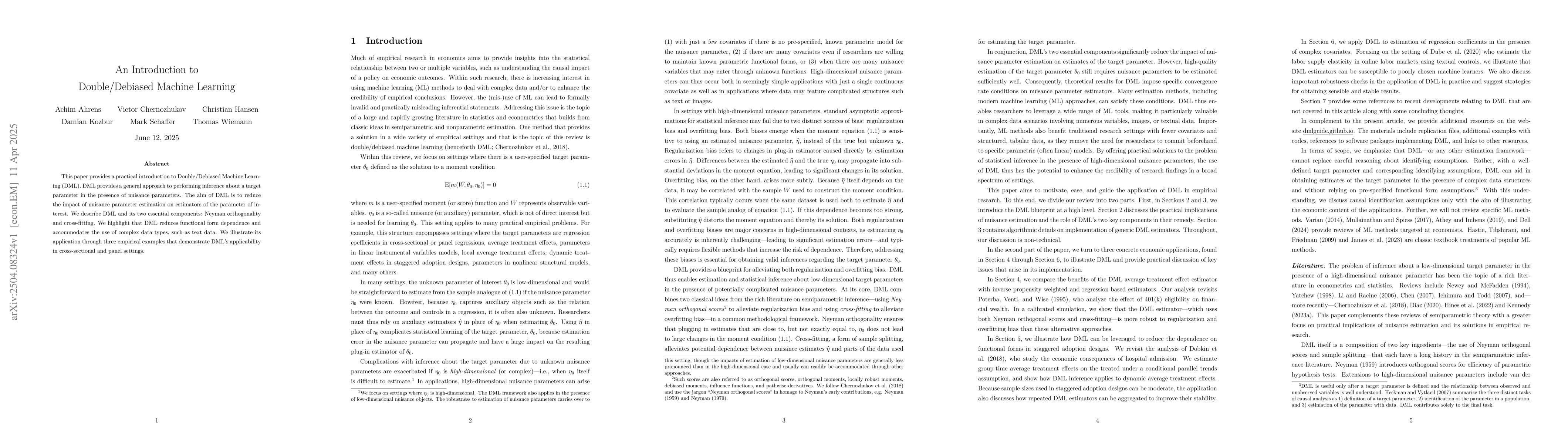 DML offers a flexible and robust approach for statistical inference in the presence of nuisance parameters, applicable across various empirical settings, including cross-sectional and panel data, and complex data types like text.
