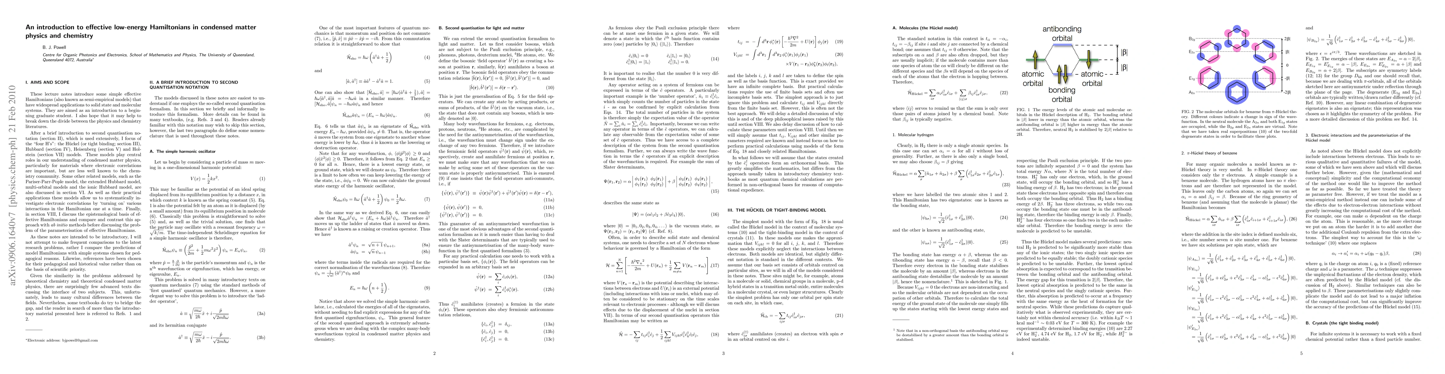 This paper introduces effective low-energy Hamiltonians for condensed matter physics and chemistry, covering popular models like Huckel, Hubbard, Heisenberg, and Holstein, with an emphasis on their applications, epistemological basis, and limitations.
