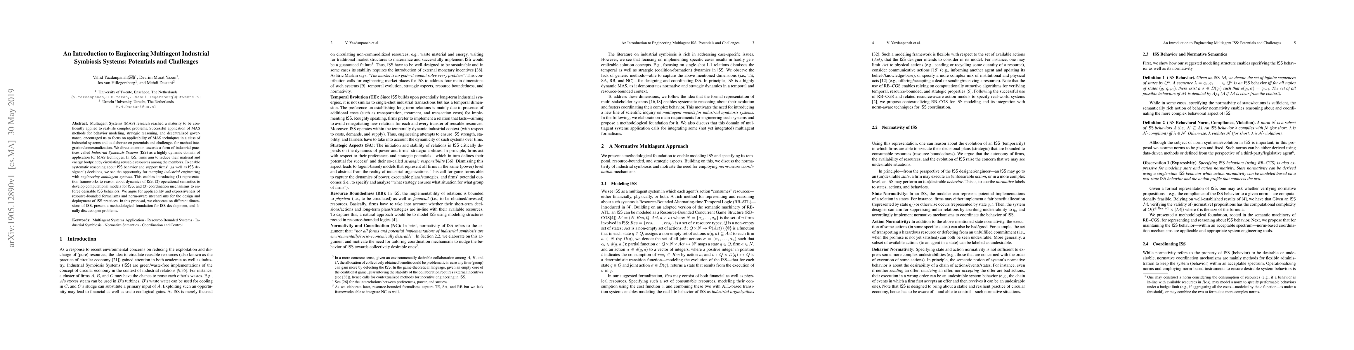 Multiagent Systems (MAS) research reached a maturity to be confidently applied to real-life complex problems. Successful application of MAS methods for behavior modeling, strategic reasoning, and decentralized governance, encouraged us to focus on applicability of MAS techniques in a class of industrial systems and to elaborate on potentials and challenges for method integration/contextualization. We direct attention towards a form of industrial practices called Industrial Symbiosis Systems (ISS) as a highly dynamic domain of application for MAS techniques. In ISS, firms aim to reduce their material and energy footprint by circulating reusable resources among the members. To enable systematic reasoning about ISS behavior and support firms' (as well as ISS designers') decisions, we see the opportunity for marrying industrial engineering with engineering multiagent systems. This enables introducing (1) representation frameworks to reason about dynamics of ISS, (2) operational semantics to develop computational models for ISS, and (3) coordination mechanisms to enforce desirable ISS behaviors. We argue for applicability and expressiveness of resource-bounded formalisms and norm-aware mechanisms for the design and deployment of ISS practices. In this proposal, we elaborate on different dimensions of ISS, present a methodological foundation for ISS development, and finally discuss open problems.