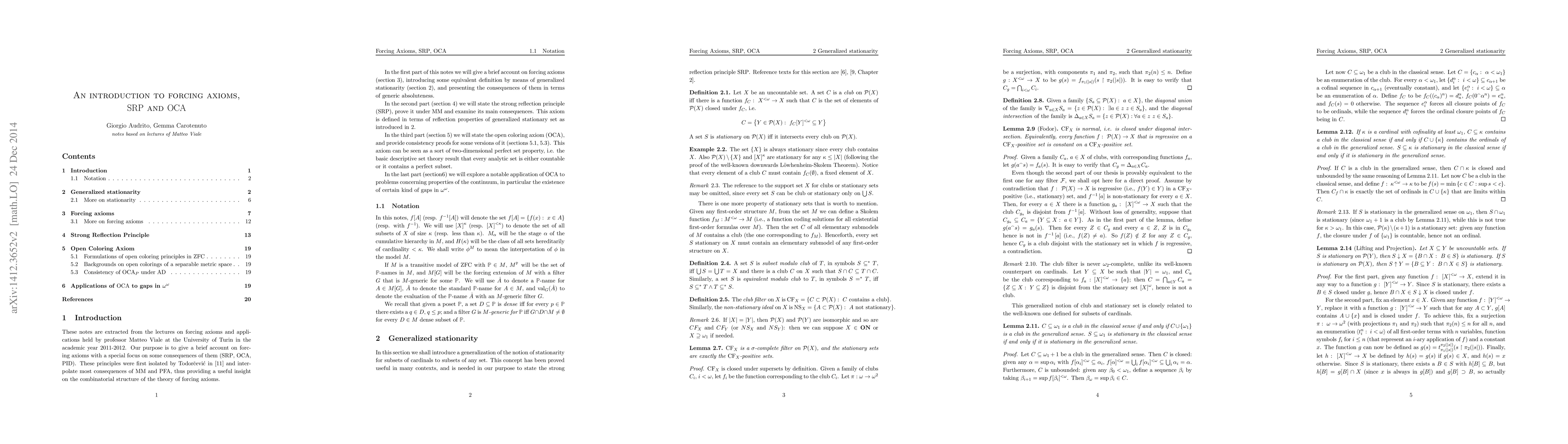 This paper provides an introduction to forcing axioms, focusing on the Strong Reflection Principle (SRP) and the Open Coloring Axiom (OCA). It outlines their definitions, consequences, and applications, particularly in the context of combinatorial structure and properties of the continuum.