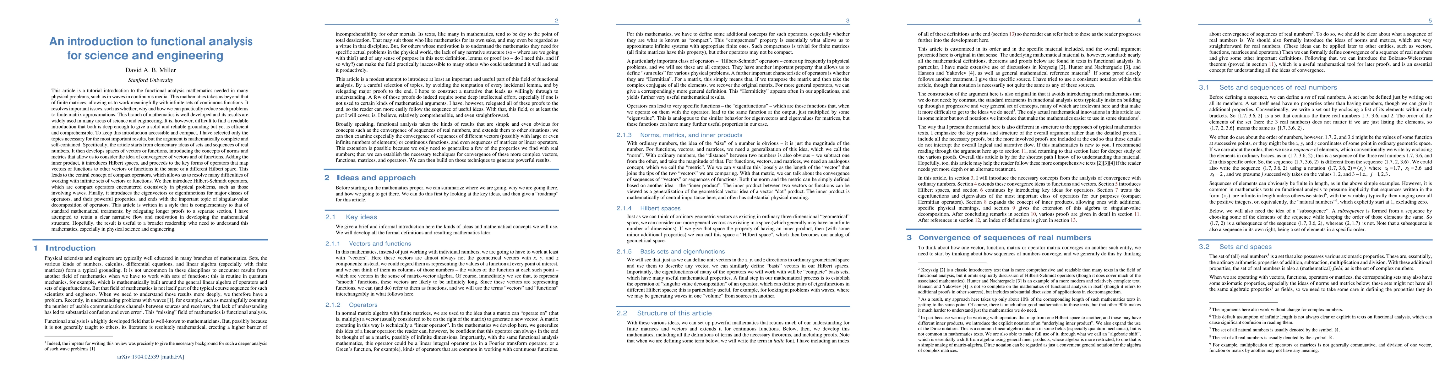 This is a tutorial introduction to the functional analysis mathematics needed in many physical problems, such as in waves in continuous media. Functional analysis takes us beyond finite matrices, allowing us to work with infinite sets of continuous functions. It resolves important issues, such as whether, why and how we can practically reduce such problems to finite matrix approximations. It is, however, difficult to find a readable introduction that is efficient and comprehensible for scientists and engineers. Here, I have selected only the topics necessary for the most important results, but the argument is mathematically complete and self-contained. The article starts from sets and sequences of real numbers. It then develops spaces of vectors or functions, introducing the concepts of norms and metrics that allow us to consider how these can converge. Adding the inner product, it introduces Hilbert spaces, and the key forms of operators that map within or between such spaces. This leads to the concept of compact operators, which allows us to resolve many difficulties of working with infinite sets of vectors or functions. We then introduce Hilbert-Schmidt operators, which are compact operators encountered extensively in physical problems, such as those involving waves. Finally, it introduces the eigenfunctions for major classes of operators, and their powerful properties, and ends with singular-value decomposition of operators. This article is written in a style that is complementary to that of standard mathematical treatments; by relegating longer proofs to a separate section, I have attempted to retain a clear narrative flow and motivation in developing the mathematical structure. Hopefully, the result is useful to a broader readership who need to understand this mathematics, especially in physical science and engineering.
