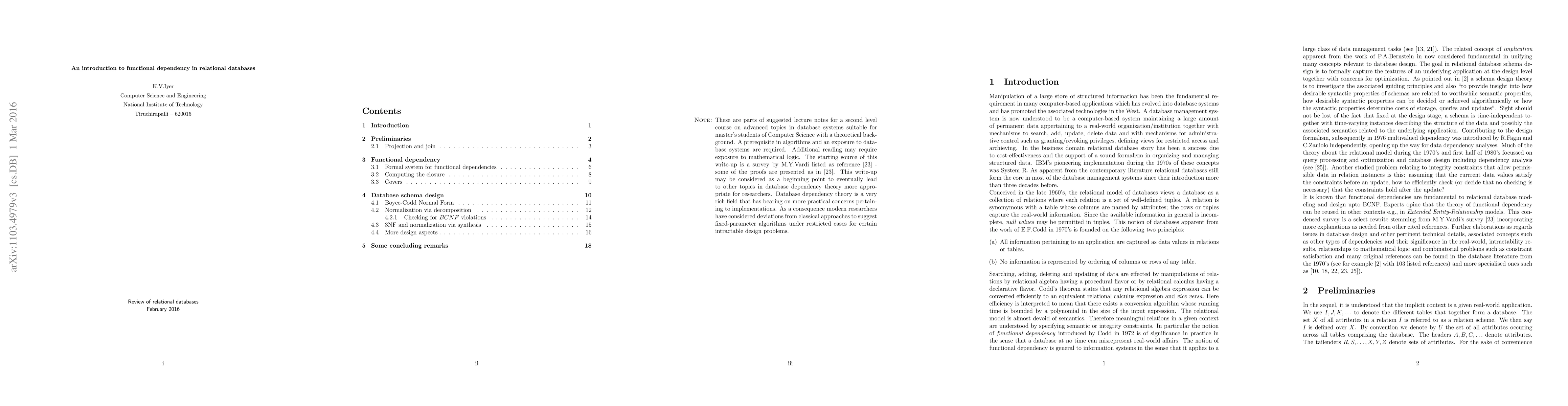 This write-up is the suggested lecture notes for a second level course on advanced topics in database systems for master's students of Computer Science with a theoretical focus. A prerequisite in algorithms and an exposure to database systems are required. Additional reading may require exposure to mathematical logic. The starting point for these notes are from M.Y.Vardi's survey listed herein as a reference - some of the proofs are presented as such . This select rewrite on functional dependency is intended to provide a few clarifications even though radically new design approaches are now being proposed.