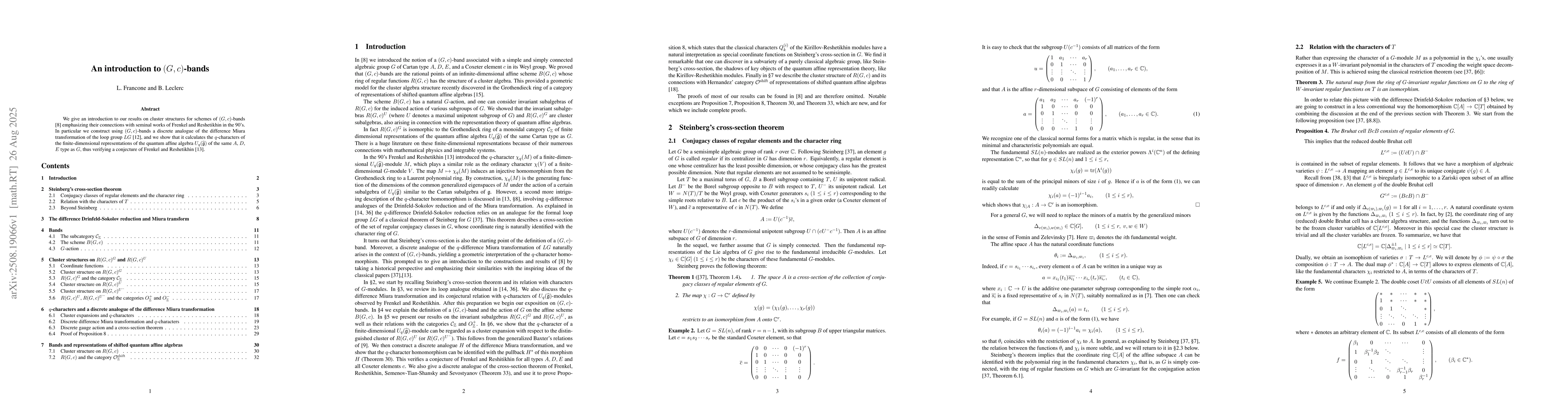 We give an introduction to our results on cluster structures for schemes of $(G,c)$-bands emphasizing their connections with seminal works of Frenkel and Reshetikhin in the 90's. In particular we construct using $(G,c)$-bands a discrete analogue of the difference Miura transformation of the loop group $LG$, and we show that it calculates the $q$-characters of the finite-dimensional representations of the quantum affine algebra $U_q(\widehat{\mathfrak{g}})$ of the same $A$, $D$, $E$ type as $G$, thus verifying a conjecture of Frenkel and Reshetikhin.