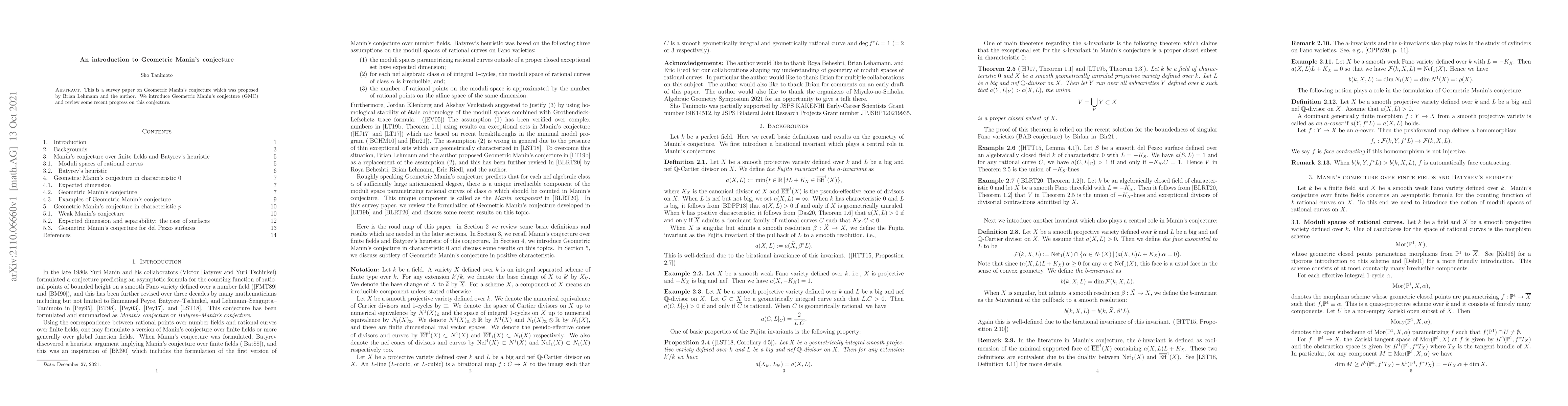 This paper introduces Geometric Manin's conjecture, a recent proposal in number theory, and reviews its progress. It aims to provide an overview of the conjecture's key findings and implications for future research.
