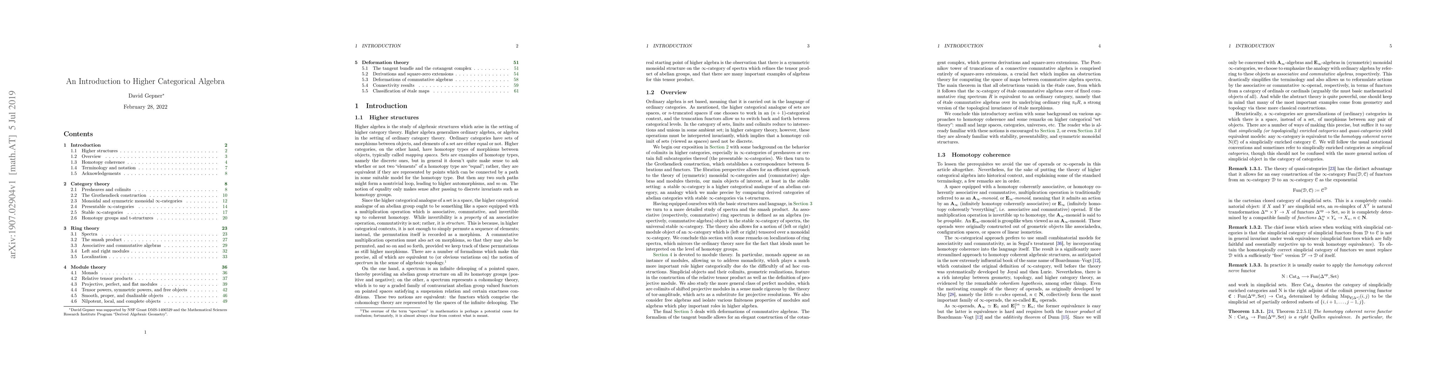 This article surveys higher categorical algebra in the $\infty$-categorical context, focusing on symmetric monoidal stable $\infty$-categories and the $\infty$-category of spectra, including ring spectra, module categories, and foundational constructions like localization and completion. It concludes with an overview of the cotangent complex and deformation theory.