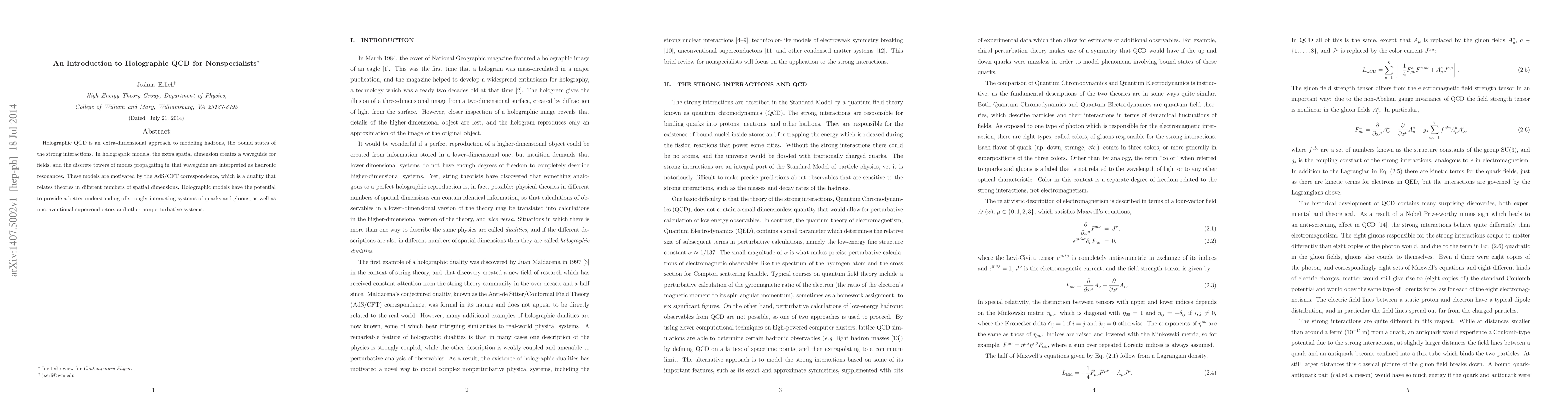 Summary: Holographic QCD uses an extra-dimensional approach to model hadrons based on the AdS/CFT correspondence, interpreting waveguide modes as hadronic resonances to better understand strongly interacting quark and gluon systems.