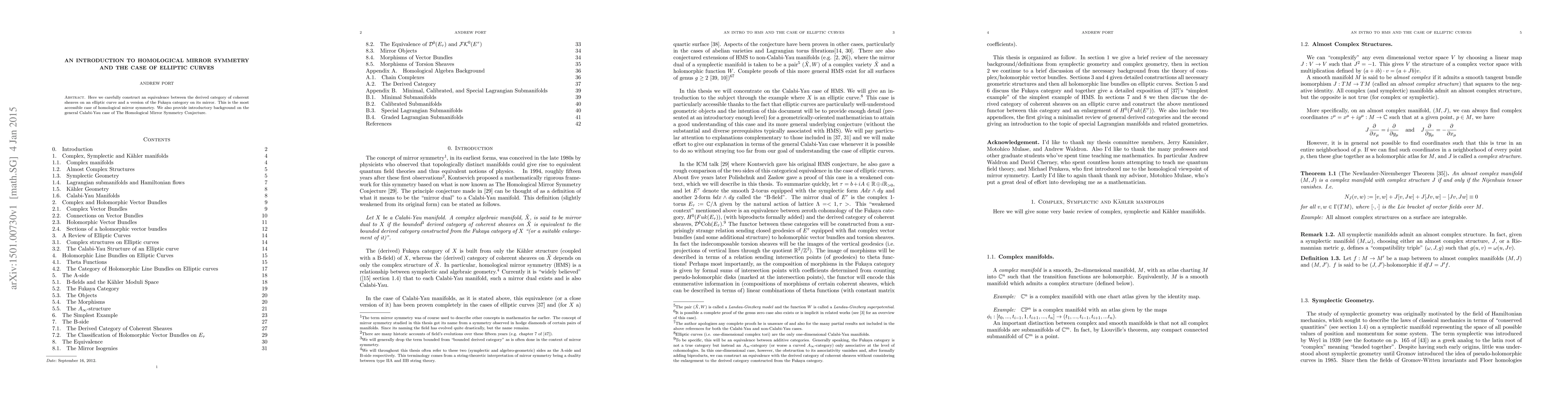 This paper establishes an equivalence between the derived category of coherent sheaves on an elliptic curve and the Fukaya category of its mirror, illustrating the foundational case of homological mirror symmetry. It also offers introductory context on the broader conjecture involving Calabi-Yau manifolds.