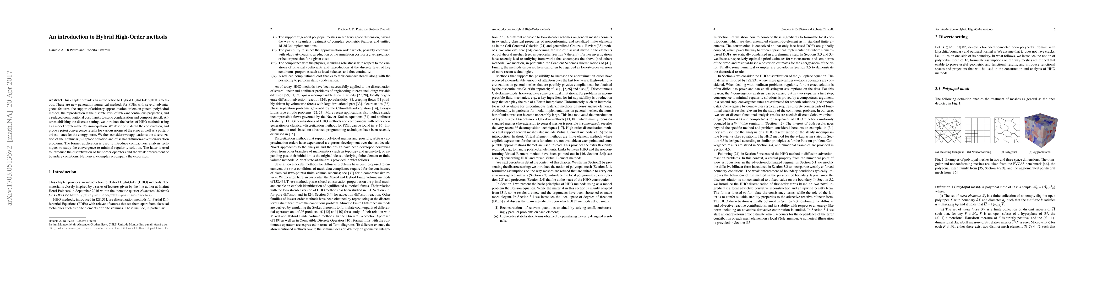 This paper introduces Hybrid High-Order (HHO) methods, a new generation of numerical techniques for PDEs that support high approximation orders on polyhedral meshes, reproduce continuous properties, and reduce computational costs. It demonstrates the method's application to the Poisson equation, nonlinear $p$-Laplace equation, and diffusion-advection-reaction problems, supported by convergence proofs and numerical examples.