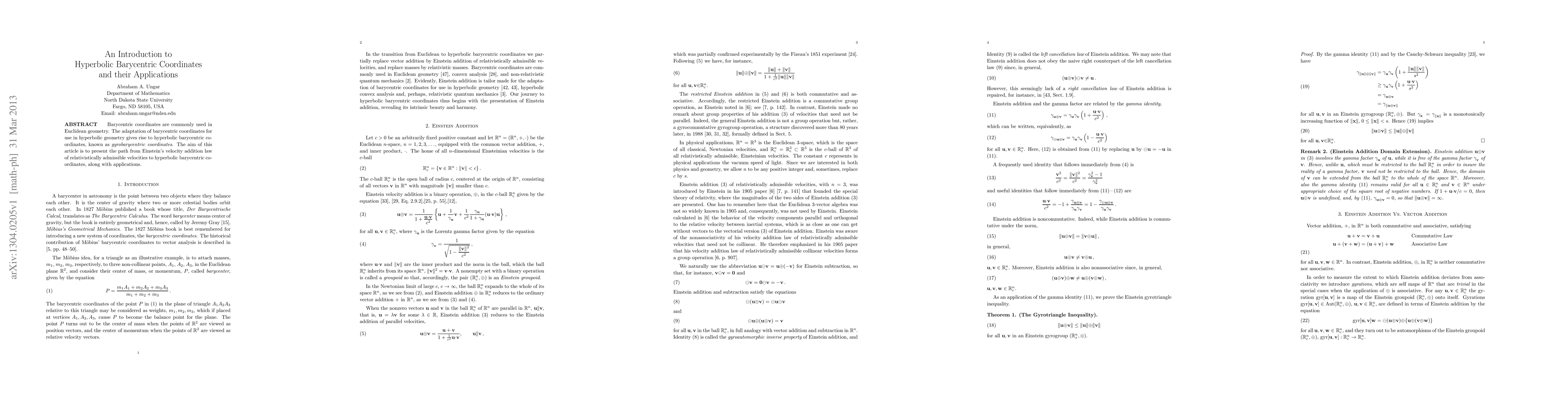 This paper introduces hyperbolic barycentric coordinates, termed gyrobarycentric coordinates, and traces their development from Einstein's velocity addition law in relativity. It explores applications of these coordinates in hyperbolic geometry.