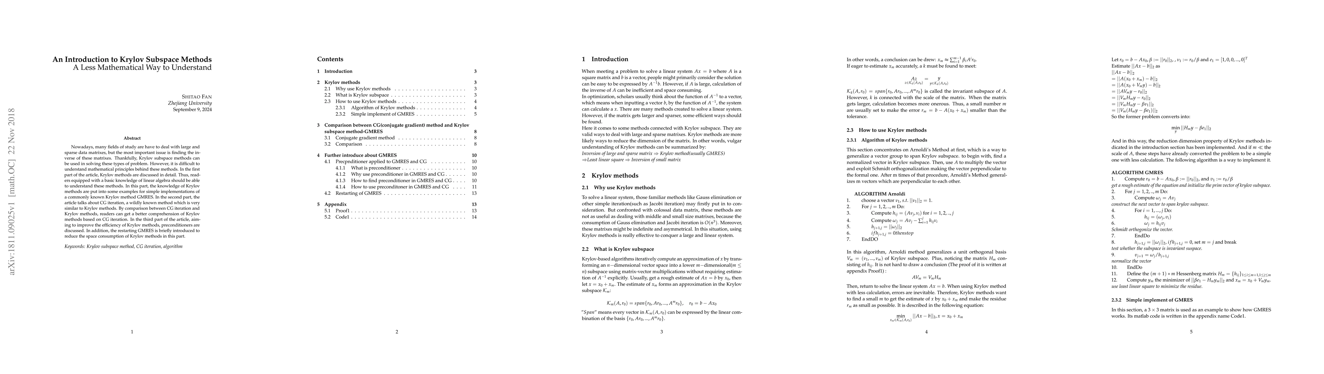 Nowadays, many fields of study are have to deal with large and sparse data matrixes, but the most important issue is finding the inverse of these matrixes. Thankfully, Krylov subspace methods can be used in solving these types of problem. However, it is difficult to understand mathematical principles behind these methods. In the first part of the article, Krylov methods are discussed in detail. Thus, readers equipped with a basic knowledge of linear algebra should be able to understand these methods. In this part, the knowledge of Krylov methods are put into some examples for simple implementations of a commonly known Krylov method GMRES. In the second part, the article talks about CG iteration, a wildly known method which is very similar to Krylov methods. By comparison between CG iteration and Krylov methods, readers can get a better comprehension of Krylov methods based on CG iteration. In the third part of the article, aiming to improve the efficiency of Krylov methods, preconditioners are discussed. In addition, the restarting GMRES is briefly introduced to reduce the space consumption of Krylov methods in this part.