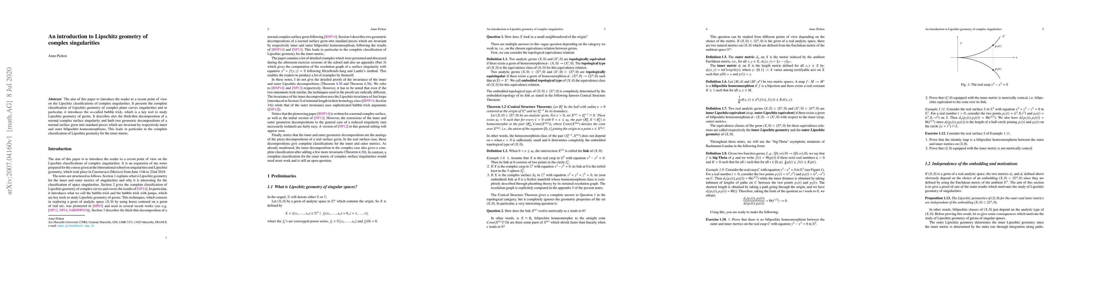 This paper introduces Lipschitz geometry classifications of complex singularities, presenting the complete classification of plane curve singularities and detailing the bubble trick and its variations. It also discusses the thick-thin decomposition of normal complex surface singularities and provides geometric decompositions invariant under bilipschitz homeomorphisms, leading to a complete classification of Lipschitz geometry for the inner metric.