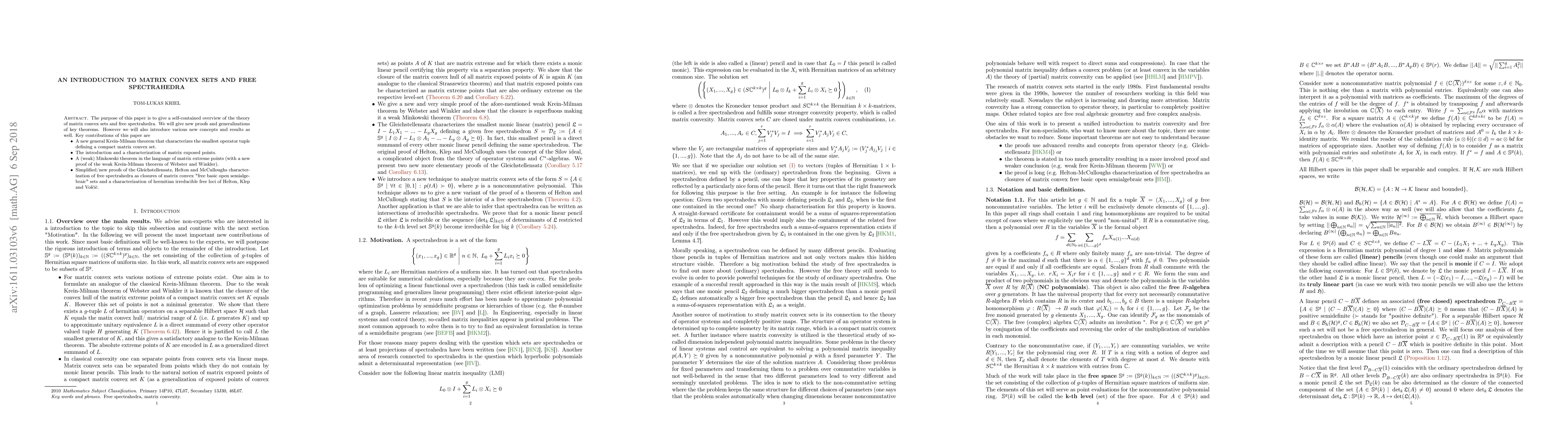 This paper provides a comprehensive introduction to matrix convex sets and free spectrahedra, offering new proofs and generalizations of key theorems. It introduces new concepts such as matrix exposed points and presents a new general Krein-Milman theorem, alongside a simplified proof of the Gleichstellensatz and characterizations of free spectrahedra and hermitian irreducible free loci.