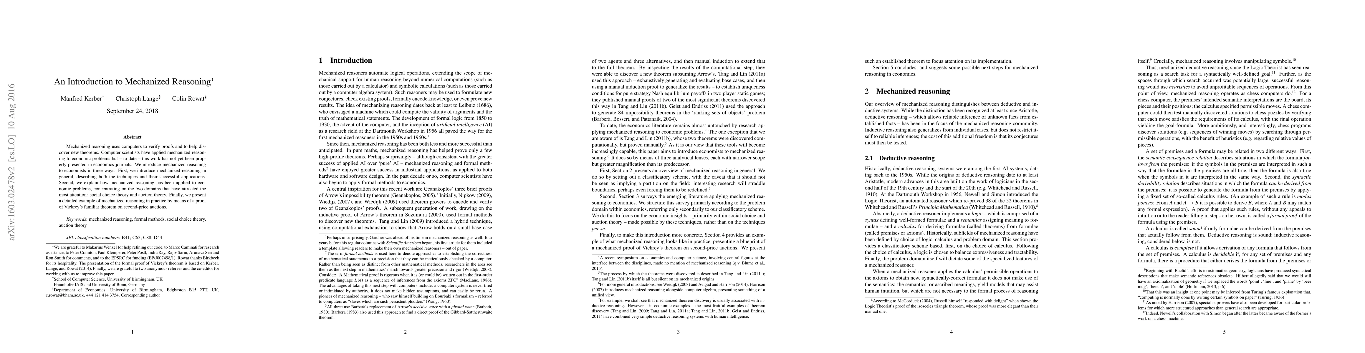 This paper introduces mechanized reasoning to economists, explaining its techniques and applications in social choice theory and auction theory, with a practical example of verifying Vickrey's theorem on second-price auctions.