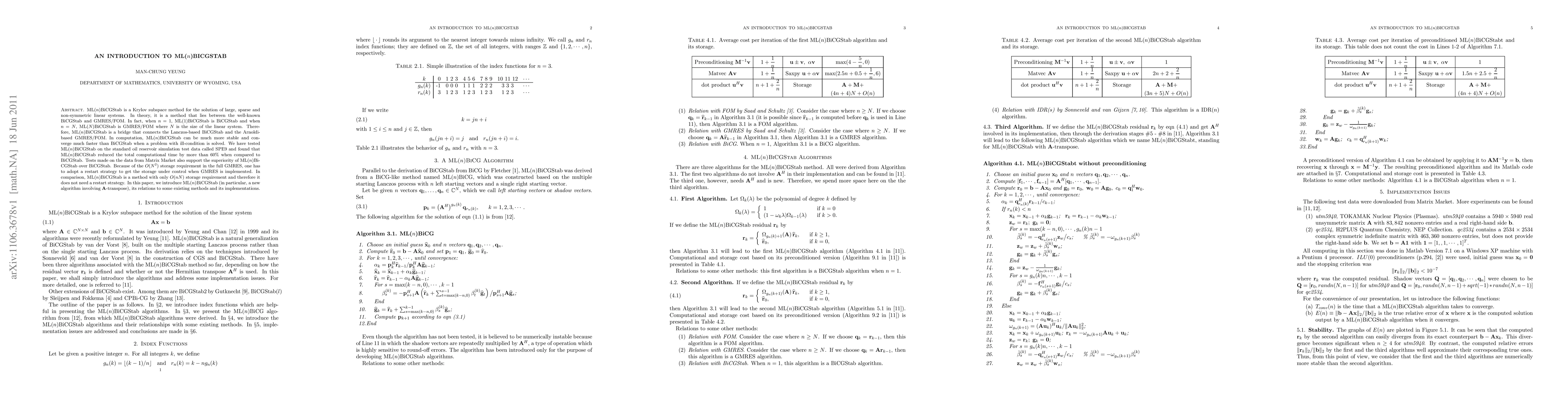ML(n)BiCGStab is a Krylov subspace method for solving large, sparse, non-symmetric linear systems, offering stability and faster convergence compared to BiCGStab. It requires only O(nN) storage, avoiding the need for restart strategies, and demonstrated a 60% reduction in computational time on test data.