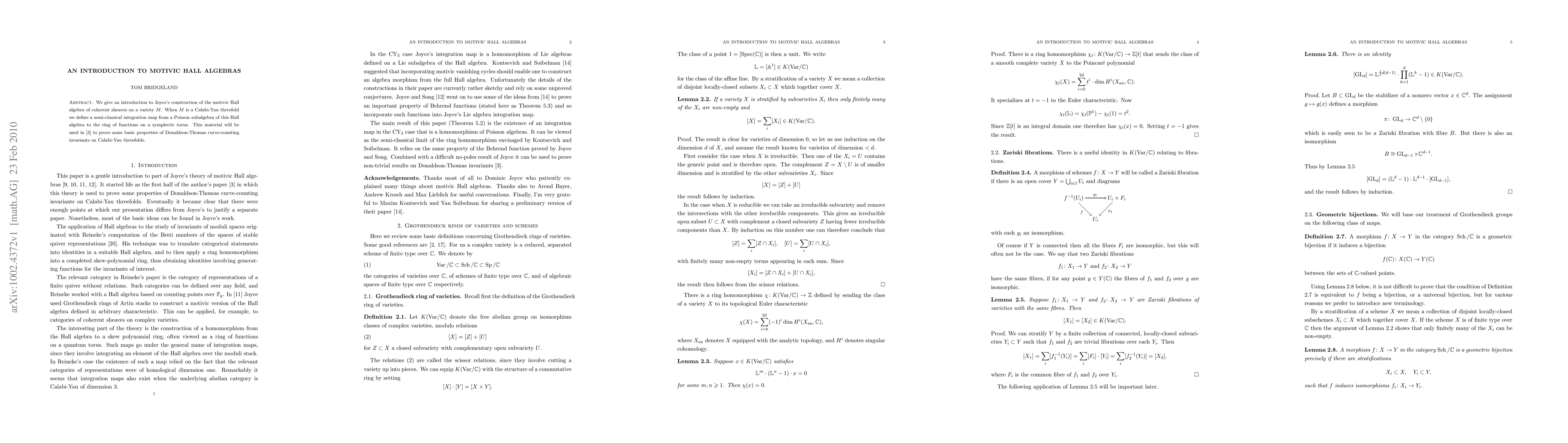 We give an introduction to Joyce's construction of the motivic Hall algebra of coherent sheaves on a variety M. When M is a Calabi-Yau threefold we define a semi-classical integration map from a Poisson subalgebra of this Hall algebra to the ring of functions on a symplectic torus. This material will be used in arxiv:1002.4374 to prove some basic properties of Donaldson-Thomas curve-counting invariants on Calabi-Yau threefolds.