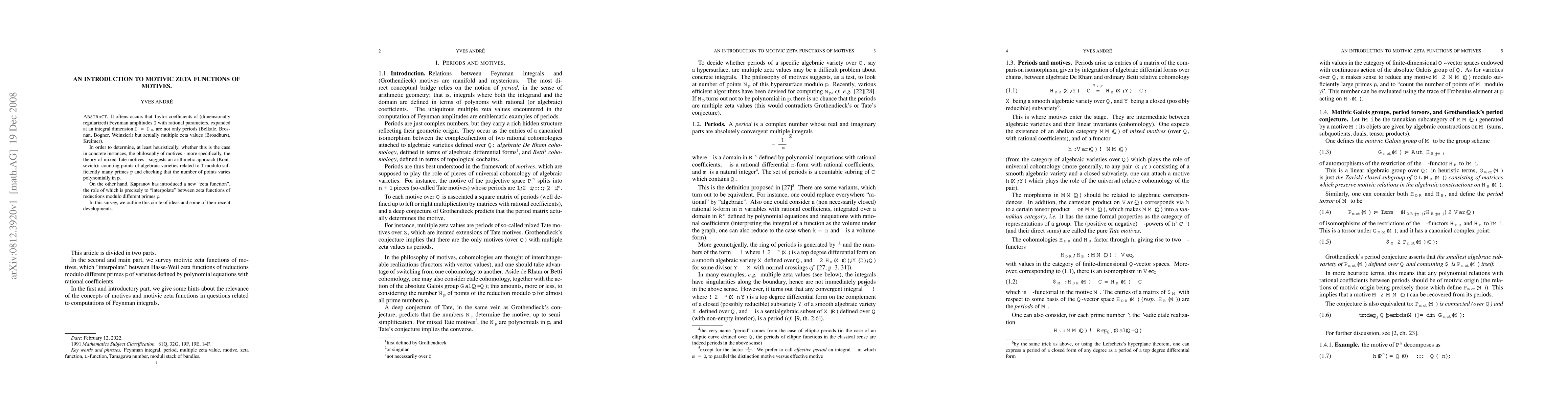 It oftens occurs that Taylor coefficients of (dimensionally regularized) Feynman amplitudes $I$ with rational parameters, expanded at an integral dimension $D= D_0$, are not only periods (Belkale, Brosnan, Bogner, Weinzierl) but actually multiple zeta values (Broadhurst, Kreimer). In order to determine, at least heuristically, whether this is the case in concrete instances, the philosophy of motives - more specifically, the theory of mixed Tate motives - suggests an arithmetic approach (Kontsevich): counting points of algebraic varieties related to $I$ modulo sufficiently many primes $p$ and checking that the number of points varies polynomially in $p$. On the other hand, Kapranov has introduced a new "zeta function", the role of which is precisely to "interpolate" between zeta functions of reductions modulo different primes $p$. In this survey, we outline this circle of ideas and some of their recent developments.