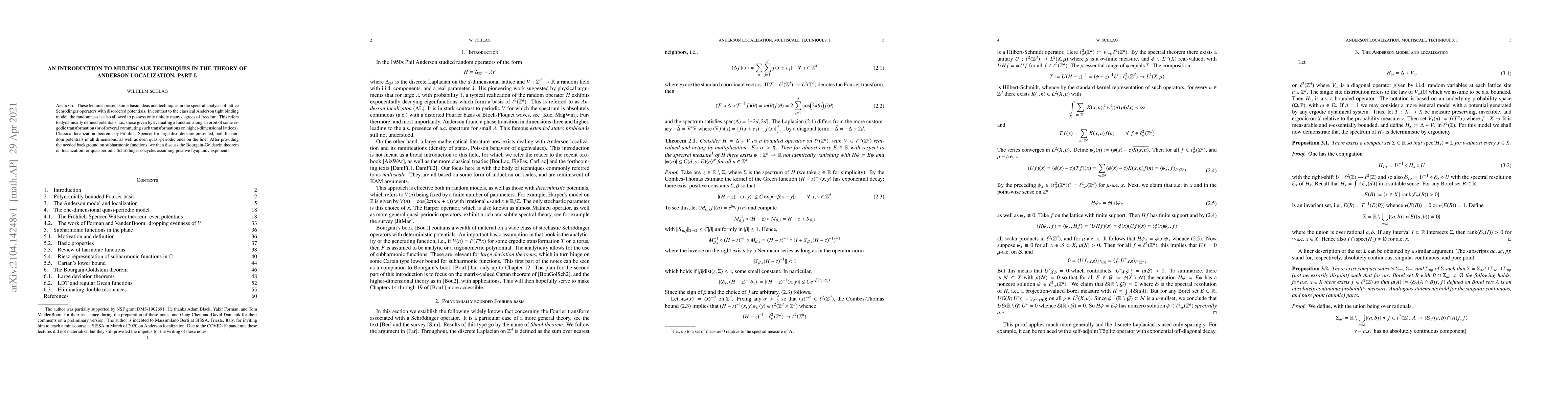 These lectures present some basic ideas and techniques in the spectral analysis of lattice Schrodinger operators with disordered potentials. In contrast to the classical Anderson tight binding model, the randomness is also allowed to possess only finitely many degrees of freedom. This refers to dynamically defined potentials, i.e., those given by evaluating a function along an orbit of some ergodic transformation (or of several commuting such transformations on higher-dimensional lattices). Classical localization theorems by Frohlich--Spencer for large disorders are presented, both for random potentials in all dimensions, as well as even quasi-periodic ones on the line. After providing the needed background on subharmonic functions, we then discuss the Bourgain-Goldstein theorem on localization for quasiperiodic Schrodinger cocycles assuming positive Lyapunov exponents.