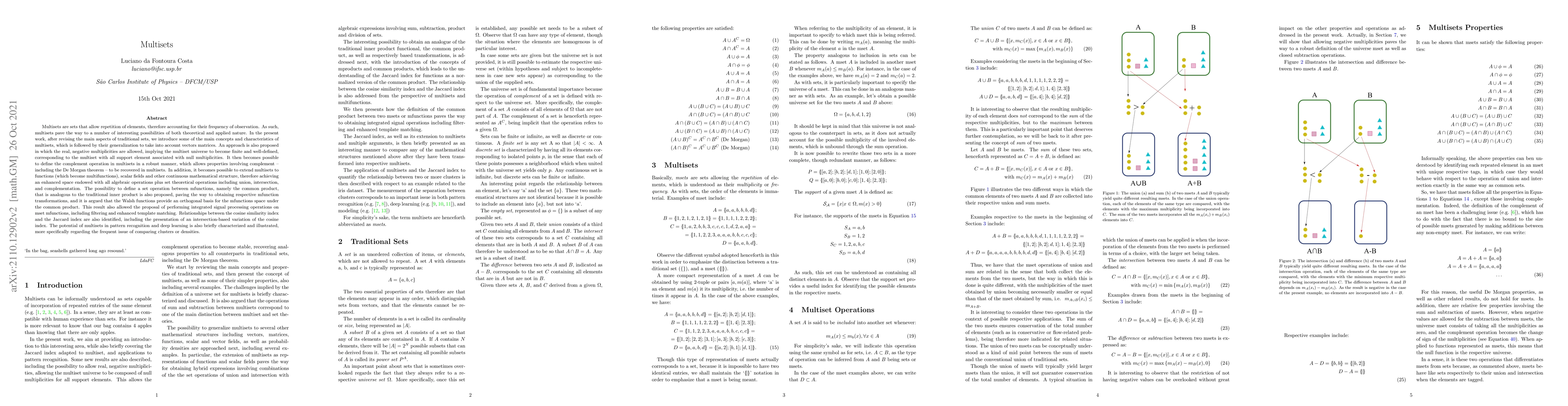 Multisets are sets that allow repetition of elements. As such, multisets pave the way to a number of interesting possibilities of theoretical and applied nature. In the present work, after revising the main aspects of traditional sets, we introduce some of the main concepts and characteristics of multisets, followed by their generalization to take into account vectors and matrices. An approach is also proposed in which the real, negative multiplicities are allowed, implying the multiset universe to become finite and well-defined, corresponding to the multiset with null multiplicities. The complement operation in multisets is then defined, which allows properties involving complement -- including the De Morgan theorem -- to be recovered in multisets. In addition, it becomes possible to extend multisets to functions (which become multifunctions), scalar fields and other continuous mathematical structure, therefore achieving an enhanced space endowed with all algebraic operations plus set theoretical operations including union, intersection, and complementation. The possibility to define a set operation between mfunctions, namely the common product, that is analogous to the traditional inner product is also proposed, paving the way to obtaining respective mfunction transformations, and it is argued that the Walsh functions provide an orthogonal basis for the mfunctions space under the common product. This result also allowed the proposal of performing integrated signal processing operations on mset mfunctions, including filtering and enhanced template matching. Relationships between the cosine similarity index and the Jaccard index are also identified, including the presentation of an intersection-based variation of the cosine index. The potential of multisets in pattern recognition and deep learning is also briefly characterized and illustrated.