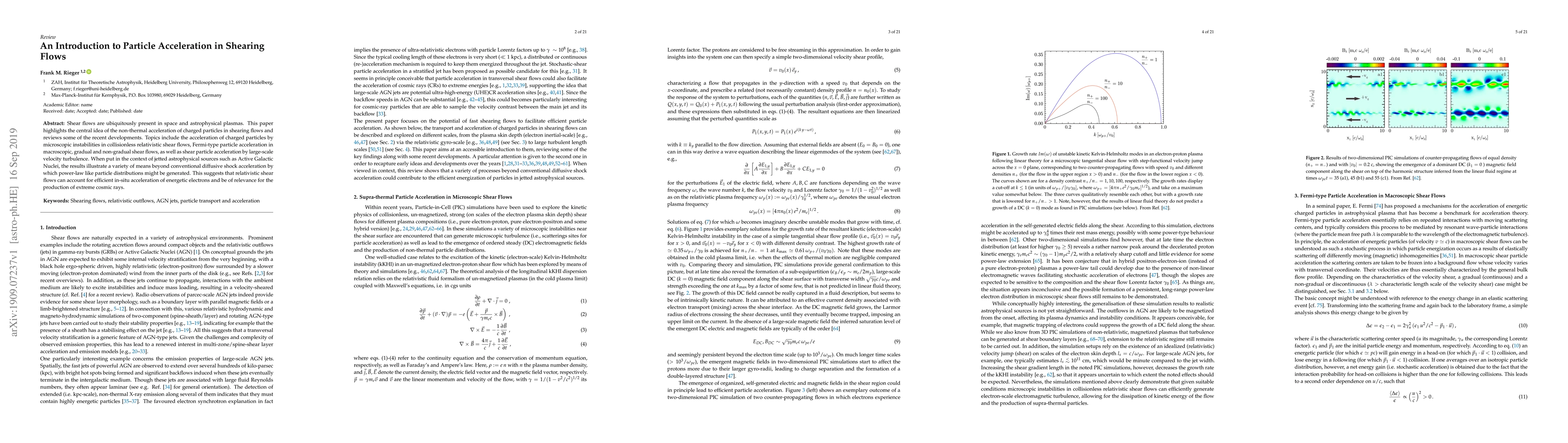Shear flows are ubiquitously present in space and astrophysical plasmas. This paper highlights the central idea of the non-thermal acceleration of charged particles in shearing flows and reviews some of the recent developments. Topics include the acceleration of charged particles by microscopic instabilities in collisionless relativistic shear flows, Fermi-type particle acceleration in macroscopic, gradual and non-gradual shear flows, as well as shear particle acceleration by large-scale velocity turbulence. When put in the context of jetted astrophysical sources such as Active Galactic Nuclei, the results illustrate a variety of means beyond conventional diffusive shock acceleration by which power-law like particle distributions might be generated. This suggests that relativistic shear flows can account for efficient in-situ acceleration of energetic electrons and be of relevance for the production of extreme cosmic rays.