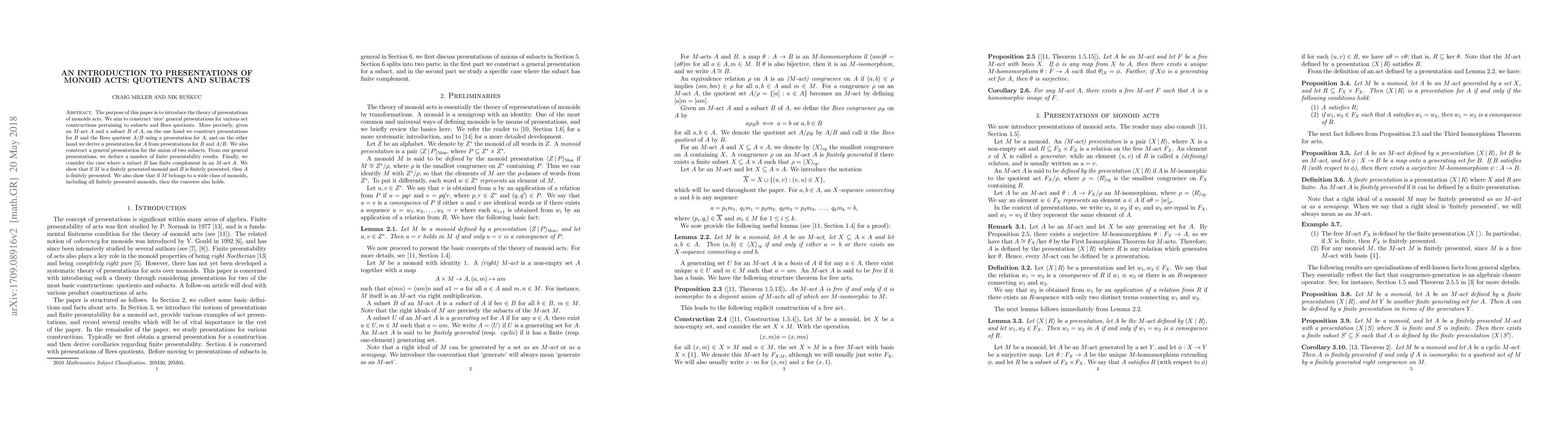 This paper introduces the theory of presentations for monoid acts, focusing on constructing general presentations for subacts and Rees quotients. It derives finite presentability results and proves that if a subact has a finite complement in a finitely generated monoid, the entire act is finitely presented.