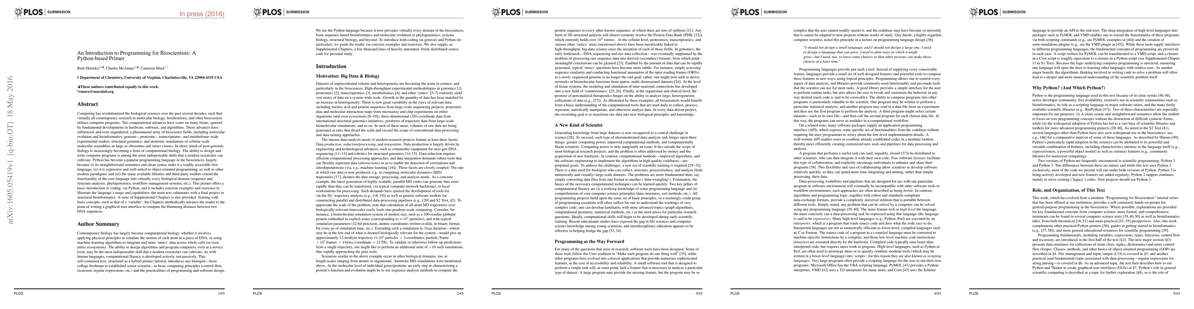 This paper introduces Python programming for bioscientists, emphasizing its accessibility, versatility, and the extensive libraries that support various biological applications. It provides a structured primer with examples and exercises, culminating in a project on structural bioinformatics.