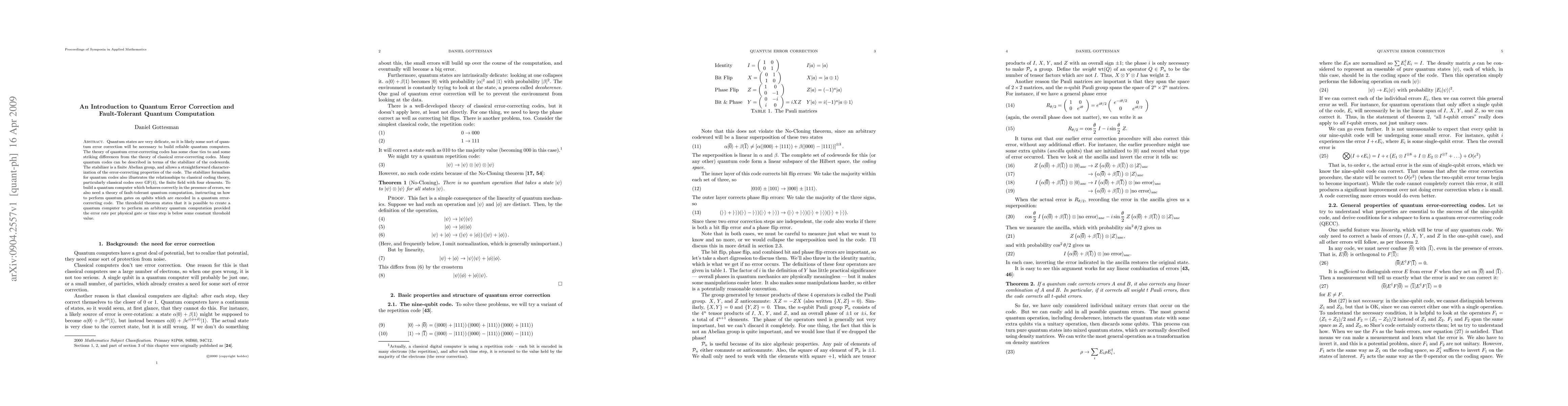 This paper introduces quantum error correction and fault-tolerant quantum computation, emphasizing the necessity of error correction for reliable quantum computing. It discusses the stabilizer formalism, which characterizes quantum error-correcting codes and relates them to classical error-correcting codes, particularly those over GF(4).