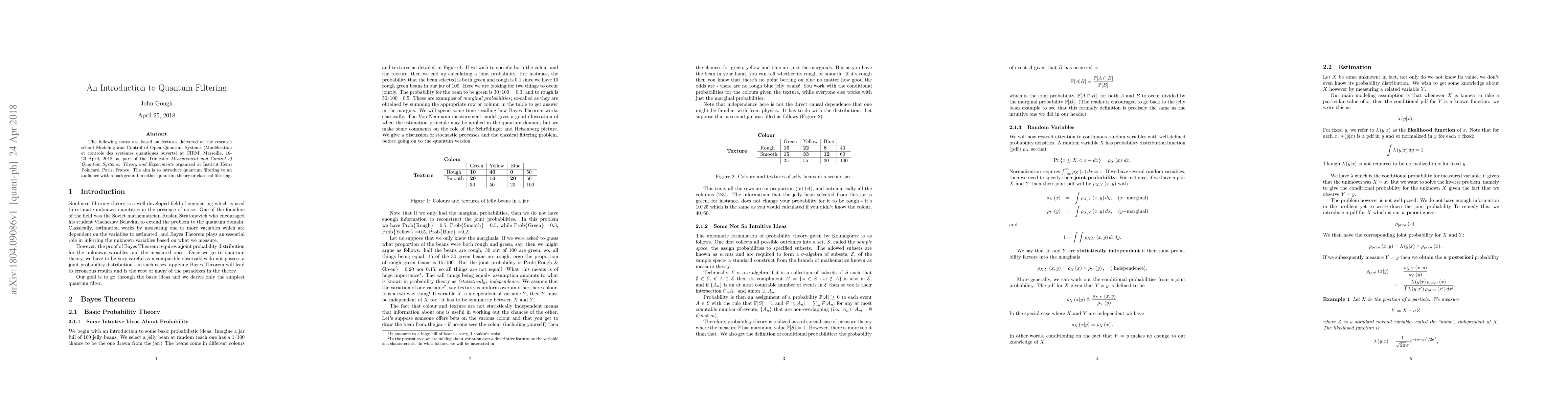 The following notes are based on lectures delivered at the research school Modeling and Control of Open Quantum Systems (Mod\'{e}lisation et contr\^{o}le des syst\`{e}mes quantiques ouverts) at CIRM, Marseille, 16-20 April, 2018, as part of the Trimester \textit{Measurement and Control of Quantum Systems: Theory and Experiments} organized at Institut Henri Poincar\'{e}, Paris, France. The aim is to introduce quantum filtering to an audience with a background in either quantum theory or classical filtering.