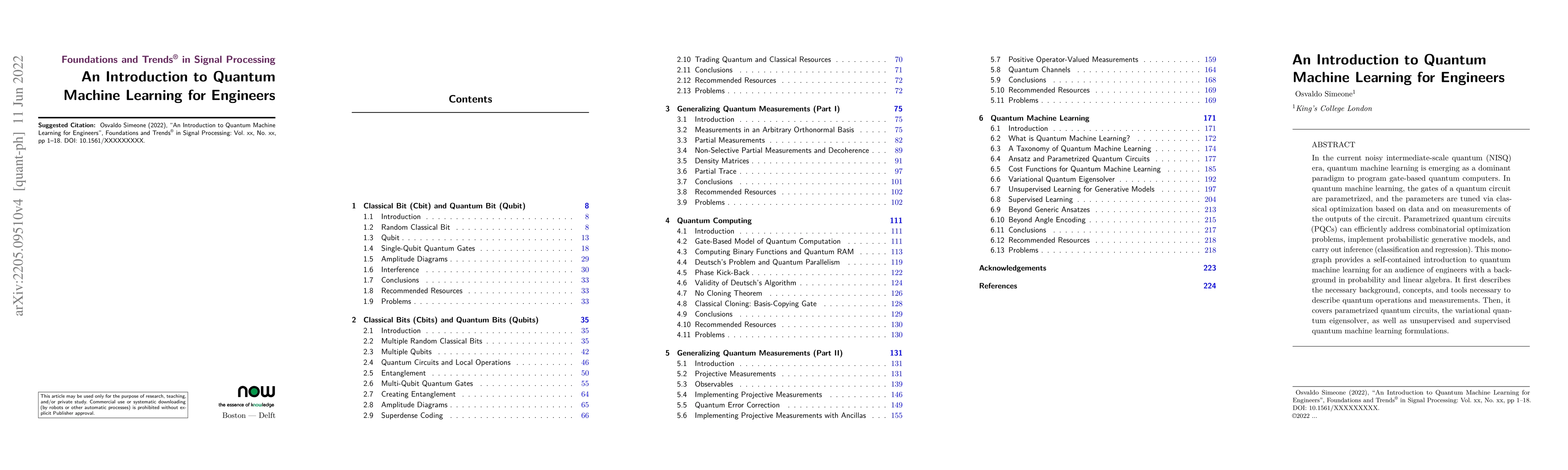 In the current noisy intermediate-scale quantum (NISQ) era, quantum machine learning is emerging as a dominant paradigm to program gate-based quantum computers. In quantum machine learning, the gates of a quantum circuit are parametrized, and the parameters are tuned via classical optimization based on data and on measurements of the outputs of the circuit. Parametrized quantum circuits (PQCs) can efficiently address combinatorial optimization problems, implement probabilistic generative models, and carry out inference (classification and regression). This monograph provides a self-contained introduction to quantum machine learning for an audience of engineers with a background in probability and linear algebra. It first describes the necessary background, concepts, and tools necessary to describe quantum operations and measurements. Then, it covers parametrized quantum circuits, the variational quantum eigensolver, as well as unsupervised and supervised quantum machine learning formulations.