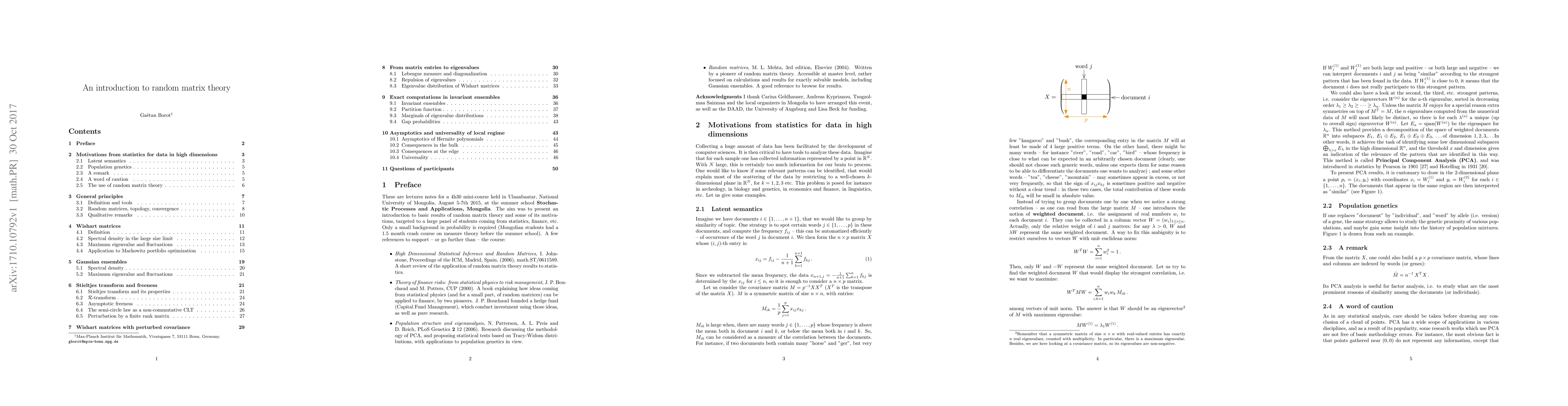 These are lectures notes for a 4h30 mini-course held in Ulaanbaatar, National University of Mongolia, August 5-7th 2015, at the summer school "Stochastic Processes and Applications". It aims at presenting an introduction to basic results of random matrix theory and some of its motivations, targeted to a large panel of students coming from statistics, finance, etc. Only a small background in probability is required.