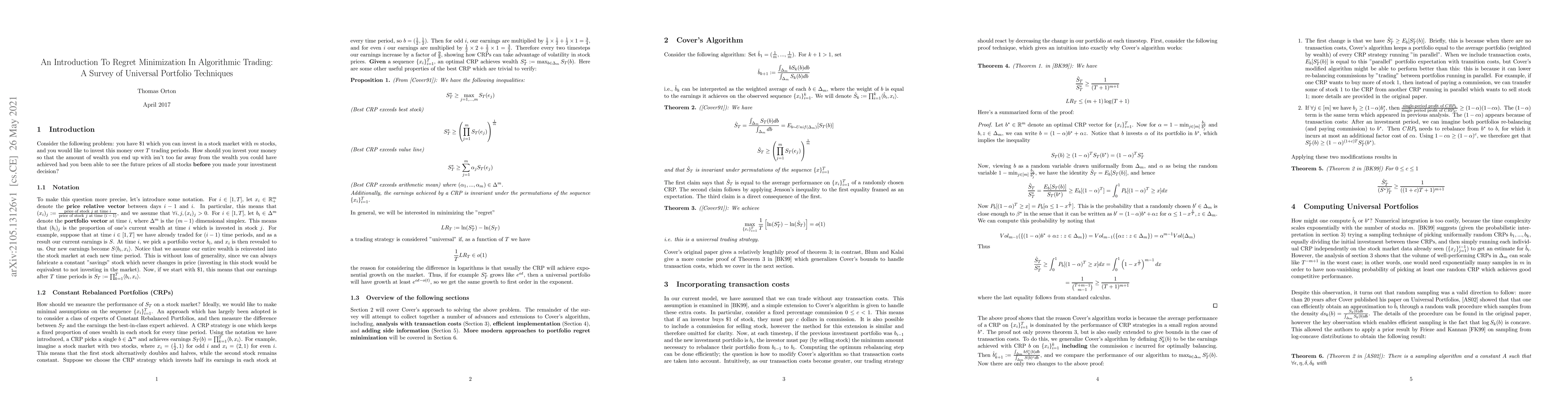 This paper introduces a survey of universal portfolio techniques in algorithmic trading, focusing on regret minimization algorithms that guarantee performance relative to a baseline without making statistical assumptions about future market data. The study covers key concepts and methods for constructing optimal portfolios, including constant rebalanced portfolios and Follow The Leader Algorithm.