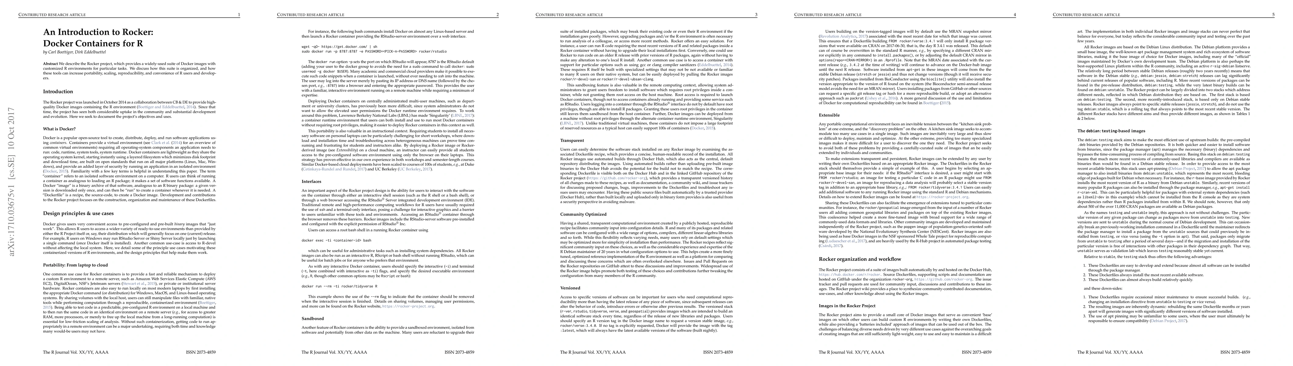 We describe the Rocker project, which provides a widely-used suite of Docker images with customized R environments for particular tasks. We discuss how this suite is organized, and how these tools can increase portability, scaling, reproducibility, and convenience of R users and developers.