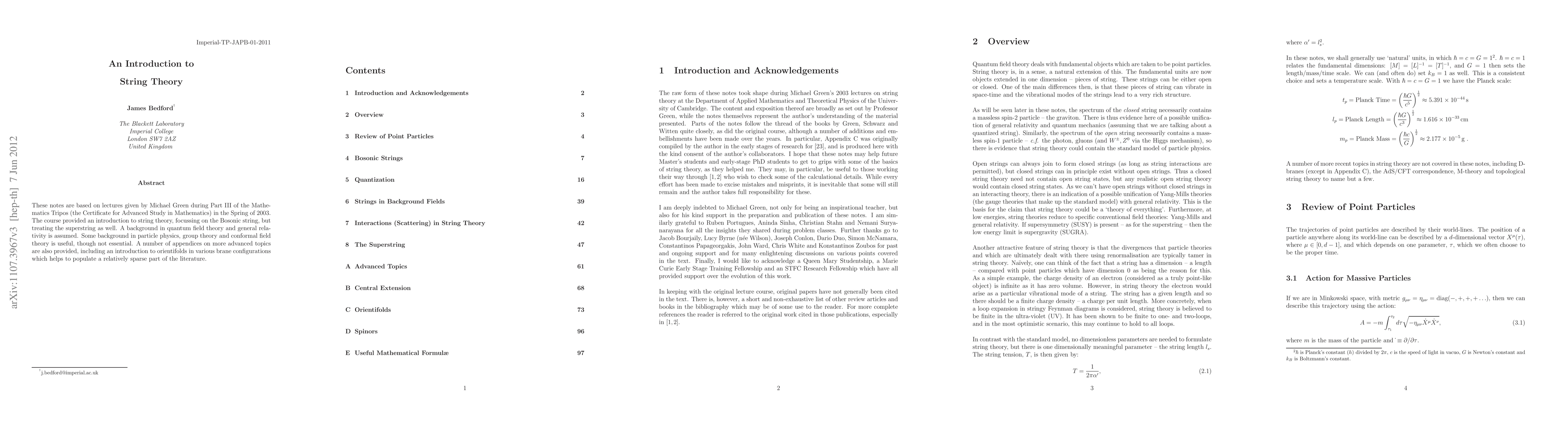 These notes are based on lectures given by Michael Green during Part III of the Mathematics Tripos (the Certificate for Advanced Study in Mathematics) in the Spring of 2003. The course provided an introduction to string theory, focussing on the Bosonic string, but treating the superstring as well. A background in quantum field theory and general relativity is assumed. Some background in particle physics, group theory and conformal field theory is useful, though not essential. A number of appendices on more advanced topics are also provided, including an introduction to orientifolds in various brane configurations which helps to populate a relatively sparse part of the literature.