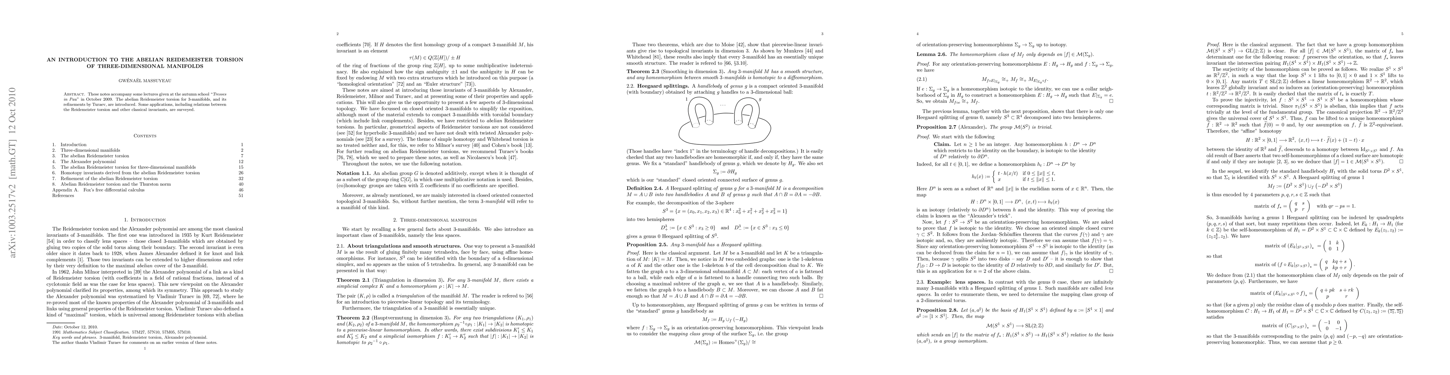 This paper introduces the abelian Reidemeister torsion for three-dimensional manifolds and discusses its refinements by Turaev, providing applications and connections to other classical invariants. It serves as a companion to lectures given at the "Tresses in Pau" school in 2009.