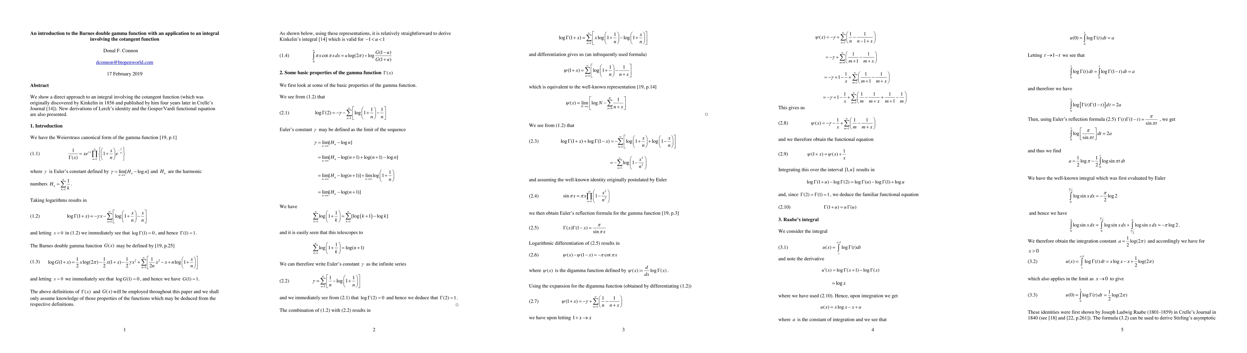 Researchers introduce a new approach to Kinkelin's integral involving the cotangent function using the Barnes double gamma function, providing a direct solution.