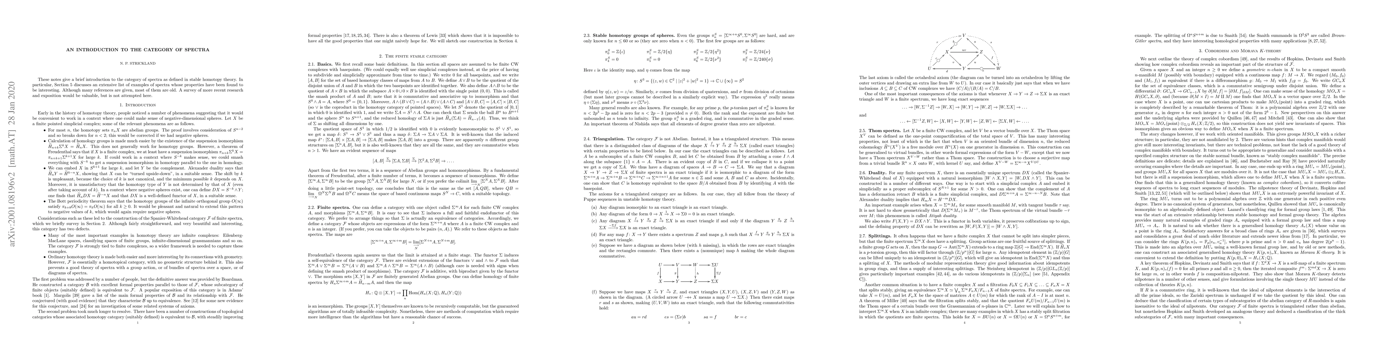 These notes give a brief introduction to the category of spectra as defined in stable homotopy theory. In particular, Section 5 discusses an extensive list of examples of spectra whose properties have been found to be interesting.