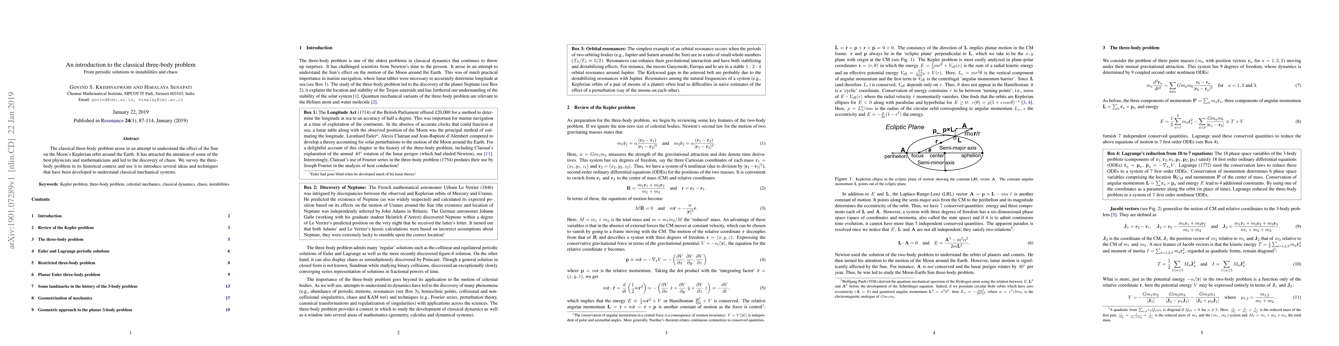 The classical three-body problem arose in an attempt to understand the effect of the Sun on the Moon's Keplerian orbit around the Earth. It has attracted the attention of some of the best physicists and mathematicians and led to the discovery of chaos. We survey the three-body problem in its historical context and use it to introduce several ideas and techniques that have been developed to understand classical mechanical systems.
