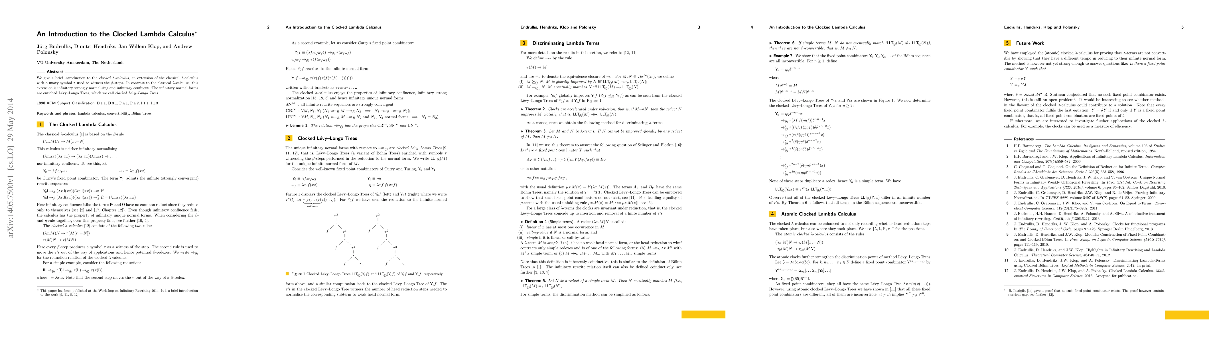 We give a brief introduction to the clocked lambda calculus, an extension of the classical lambda calculus with a unary symbol tau used to witness the beta-steps. In contrast to the classical lambda calculus, this extension is infinitary strongly normalising and infinitary confluent. The infinitary normal forms are enriched Boehm Trees, which we call clocked Boehm Trees.