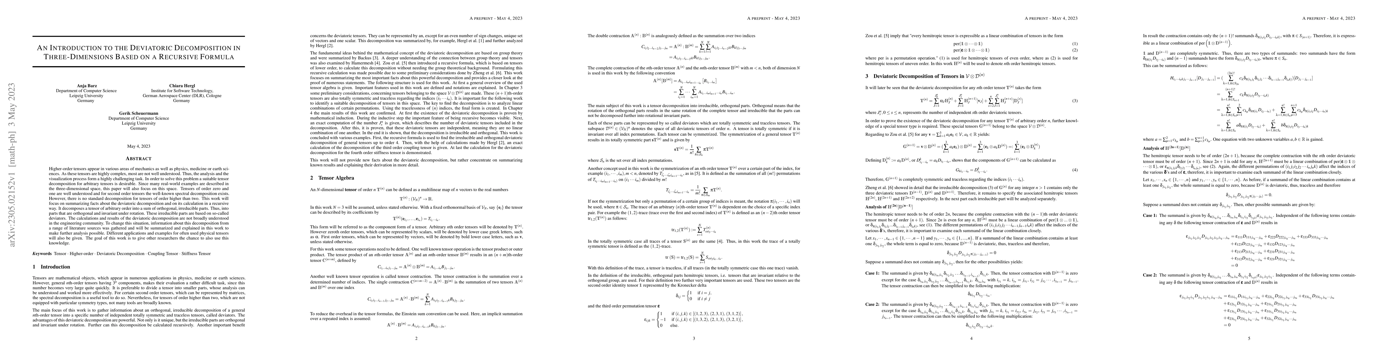 Higher-order tensors appear in various areas of mechanics as well as physics, medicine or earth sciences. As these tensors are highly complex, most are not well understood. Thus, the analysis and the visualization process form a highly challenging task. In order to solve this problem a suitable tensor decomposition for arbitrary tensors is desirable. Since many real-world examples are described in the three-dimensional space, this paper will also focus on this space. Tensors of order zero and one are well understood and for second order tensors the well-known spectral decomposition exists. However, there is no standard decomposition for tensors of order higher than two. This work will focus on summarizing facts about the deviatoric decomposition and on its calculation in a recursive way. It decomposes a tensor of arbitrary order into a sum of orthogonal, irreducible parts. Thus, into parts that are orthogonal and invariant under rotation. These irreducible parts are based on so-called deviators. The calculations and results of the deviatoric decomposition are not broadly understood in the engineering community. To change this situation, information about this decomposition from a range of literature sources was gathered and will be summarized and explained in this work to make further analysis possible. Different applications and examples for often used physical tensors will also be given. The goal of this work is to give other researchers the chance to also use this knowledge.