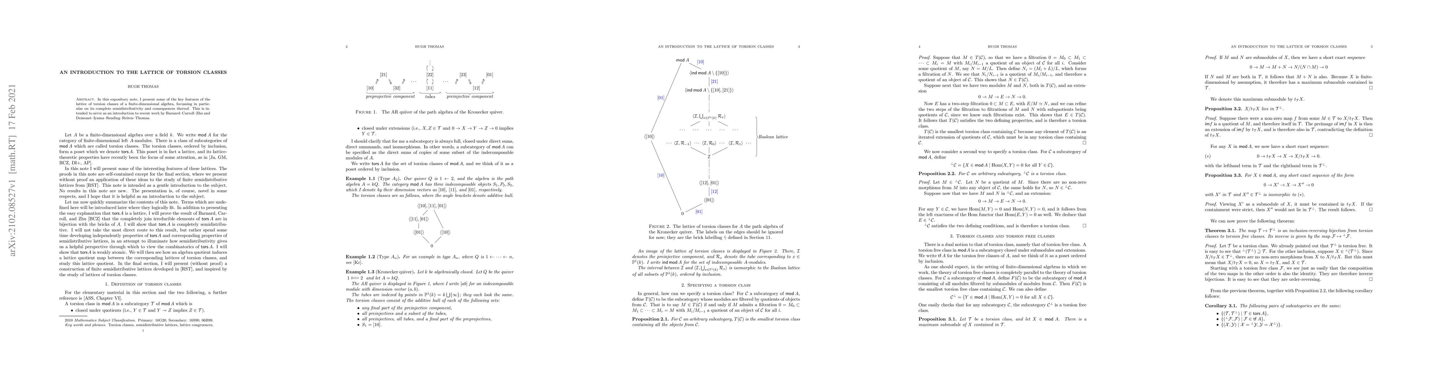 In this expository note, I present some of the key features of the lattice of torsion classes of a finite-dimensional algebra, focussing in particular on its complete semidistributivity and consequences thereof. This is intended to serve as an introduction to recent work by Barnard-Carroll-Zhu and Demonet-Iyama-Reading-Reiten-Thomas.