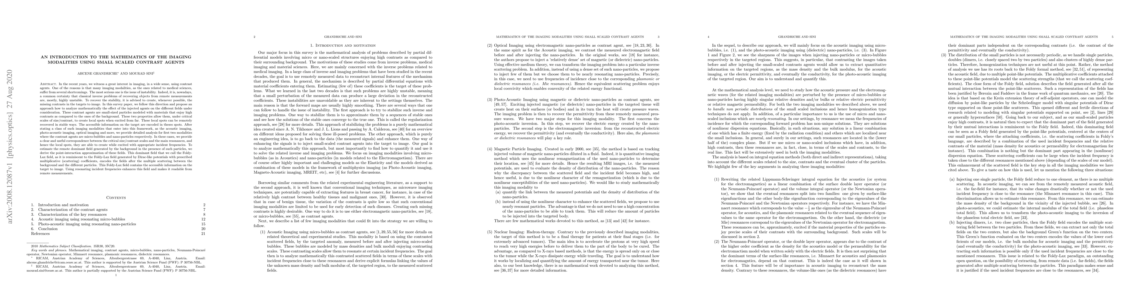 In the recent years, we witness a great interest in imaging, in a wide sense, using contrast agents. One of the reasons is that many imaging modalities, as the ones related to medical sciences, suffer from several shortcomings. The most serious one is the issue of instability. Indeed, it is, nowadays, a common certainty that classical inverse problems of recovering objects from remote measurements are, mostly, highly unstable. To recover the stability, it is advised to create, whenever possible, the missing contrasts in the targets to image. In this survey paper, we follow this direction and propose an approach how to analyze mathematically the effect of the injected agents on the different fields under consideration. These contrast agents are small-sized particles modeled with materials that enjoy high contrasts as compared to the ones of the background. These two properties allow them, under critical scales of size/contrast, to create local spots when excited from far. These local spots can be remotely recovered in stable ways. The accessible information on the target are encoded in theses spots. After stating a class of such imaging modalities that enter into this framework, as the acoustic imaging, photo-acoustic imaging, optical imaging and more, we provide detailed analysis for first two modalities where the contrast agents are micro-bubbles and nano-particles respectively.
