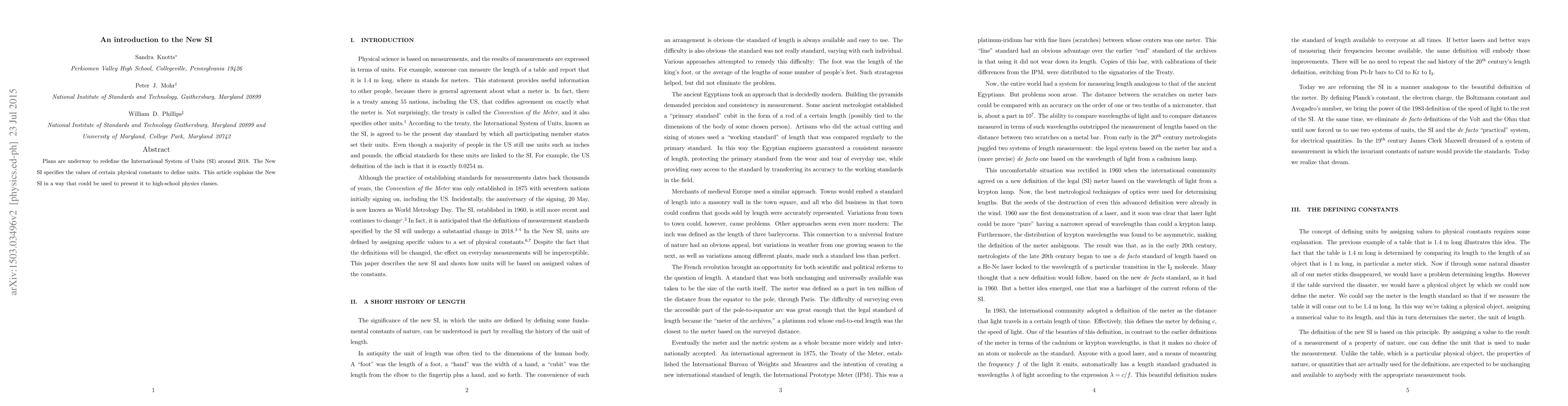 Plans are underway to redefine the International System of Units (SI) around 2018. The New SI specifies the values of certain physical constants to define units. This article explains the New SI in a way that could be used to present it to high-school physics classes.