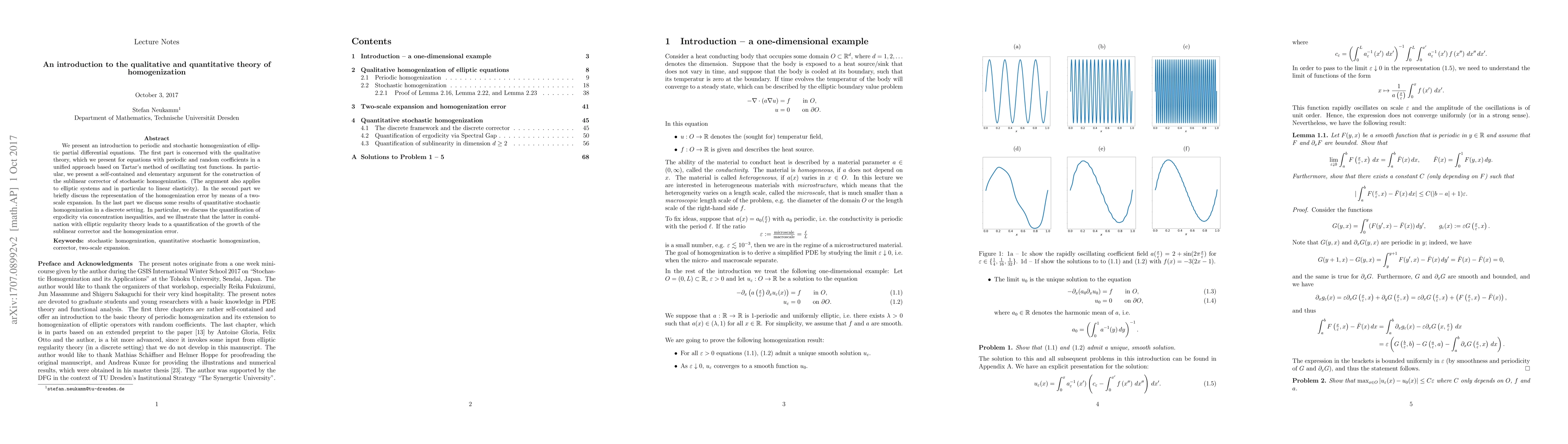 This paper introduces both qualitative and quantitative theories of homogenization for elliptic partial differential equations, focusing on periodic and stochastic cases. It employs Tartar's method for constructing the sublinear corrector and discusses two-scale expansions for error representation, alongside quantitative results in stochastic homogenization.