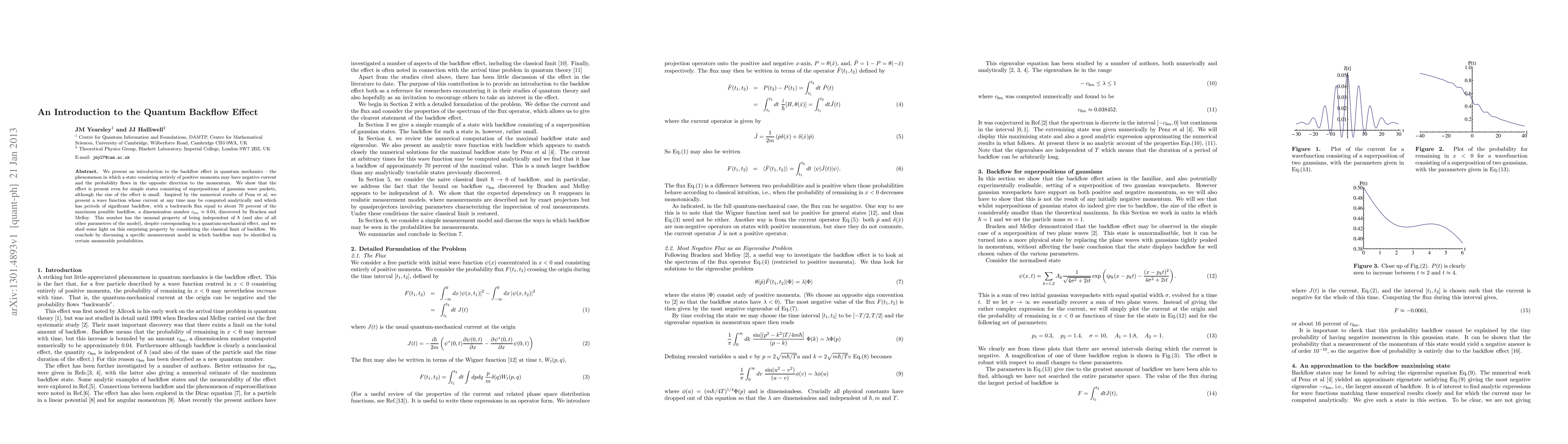 This paper introduces the quantum backflow effect, where positive momentum states exhibit negative current and opposite probability flow. It demonstrates significant backflow in simple Gaussian wave packet superpositions, with a dimensionless backflow constant $c_{bm} \approx 0.04$ that remains $\hbar$-independent, and discusses a measurement model to identify this phenomenon.