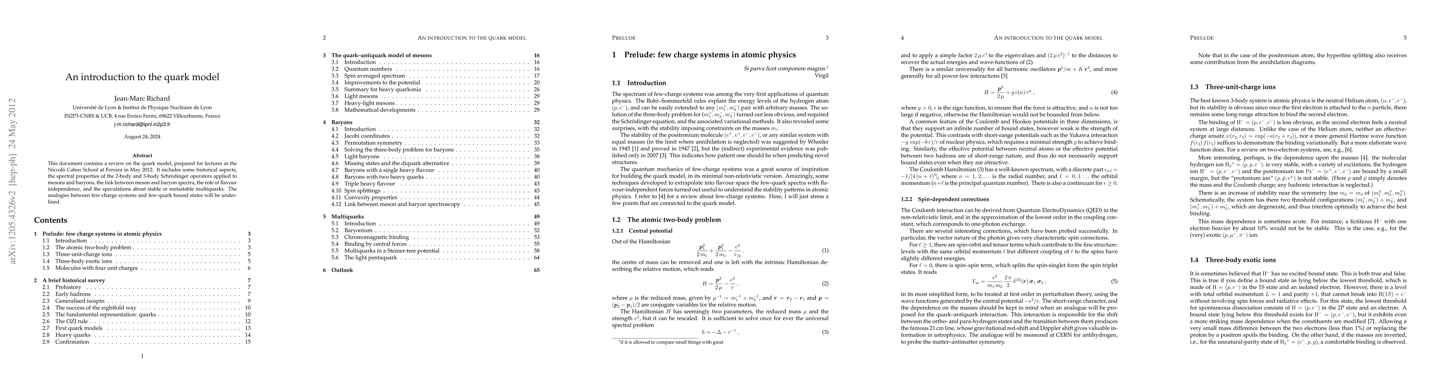 This document contains a review on the quark model, prepared for lectures at the Niccolo Cabeo School at Ferrara in May 2012. It includes some historical aspects, the spectral properties of the 2-body and 3-body Schroedinger operators applied to mesons and baryons, the link between meson and baryon spectra, the role of flavour independence, and the speculations about stable or metastable multiquarks. The analogies between few-charge systems and few-quark bound states will be underlined.