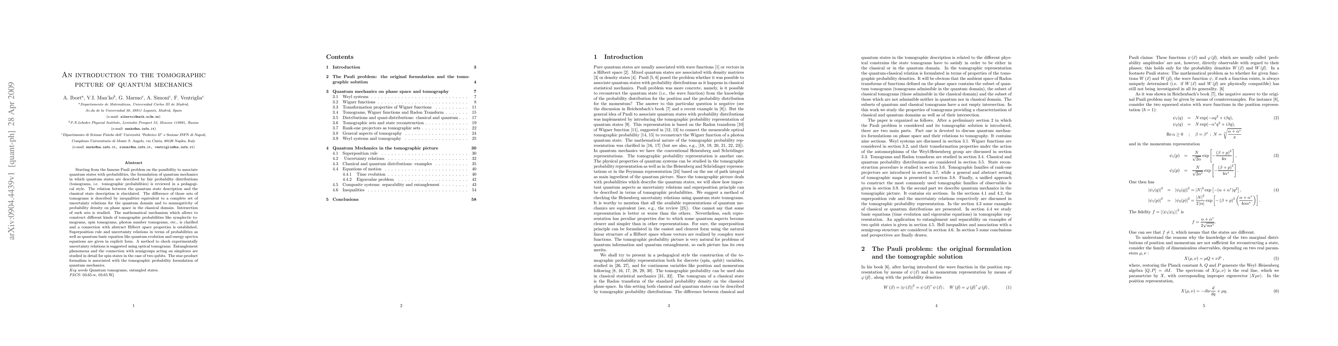 This paper introduces the tomographic representation of quantum mechanics, explaining how quantum states can be described by tomographic probabilities. It explores the relationship between quantum and classical state descriptions, highlighting the mathematical mechanisms for constructing various tomographic probabilities and their connection to the abstract Hilbert space. The paper also discusses entanglement, uncertainty relations, and a method to experimentally verify these relations using optical tomograms.
