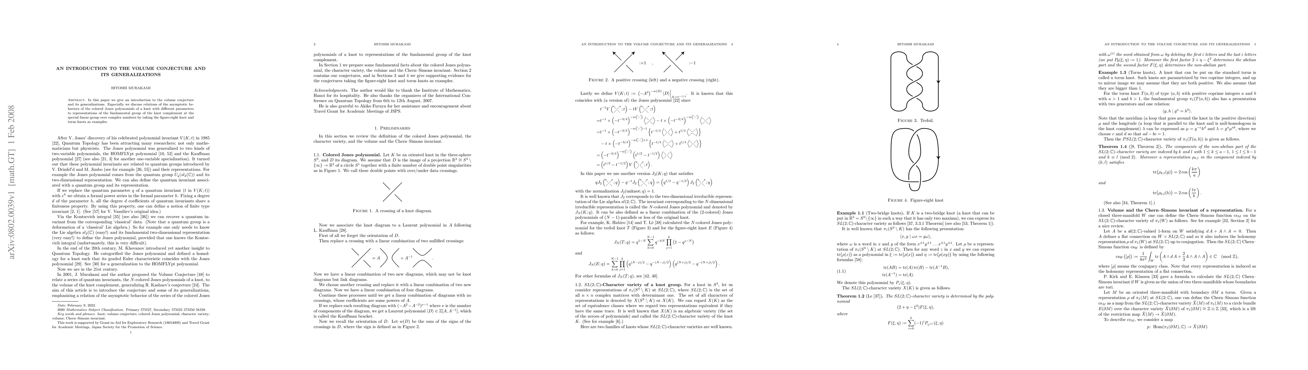 This paper introduces the volume conjecture and its generalizations, focusing on how the asymptotic behaviors of colored Jones polynomials relate to representations of the fundamental group of knot complements, illustrated through figure-eight and torus knots.