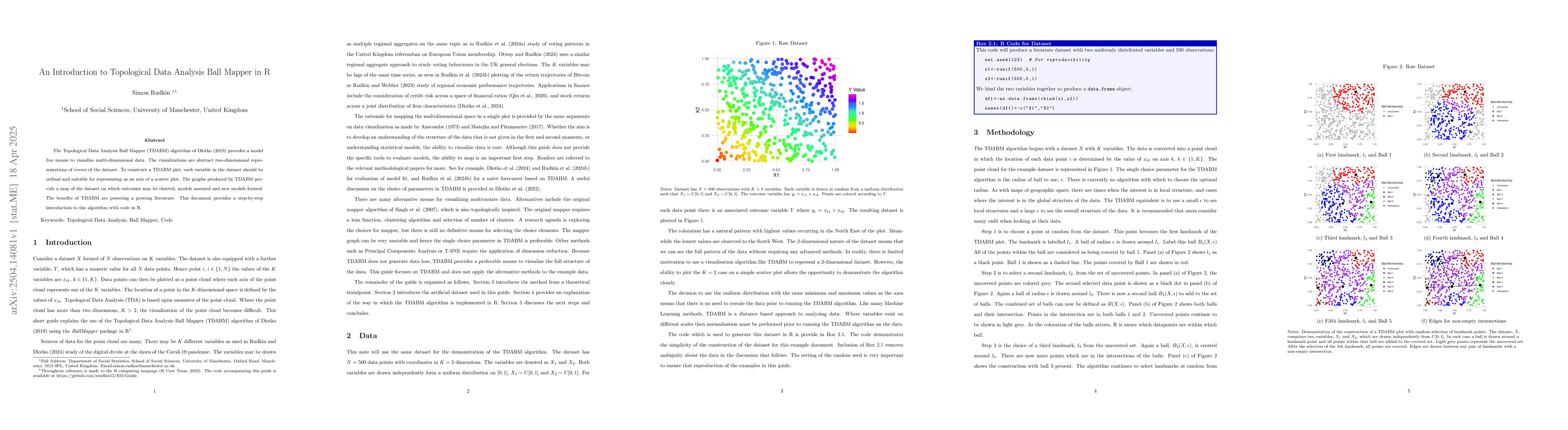 The paper introduces the Topological Data Analysis Ball Mapper (TDABM) algorithm implemented in R, providing a model-free method to visualize multi-dimensional data through abstract two-dimensional representations called covers.